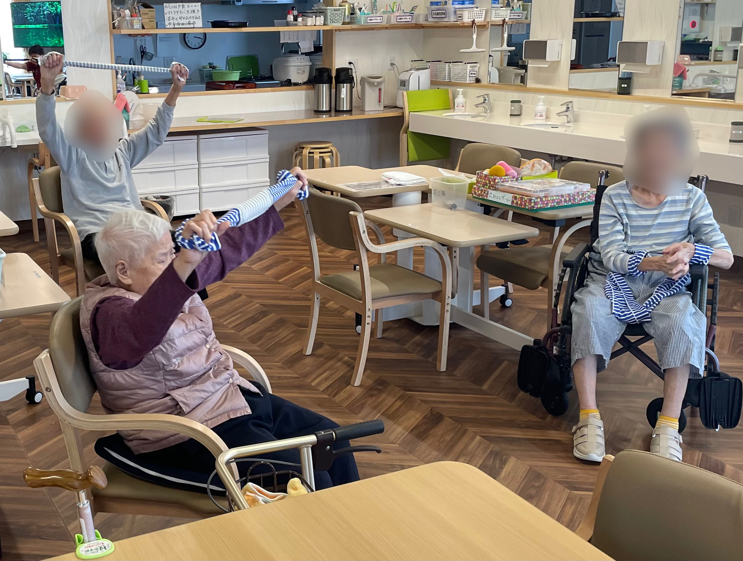 今月のタオルを使ったリハビリ体操ですが、利用者様たちもだんだんと慣れてきたようで、可動域が徐々に広くなってきています☺