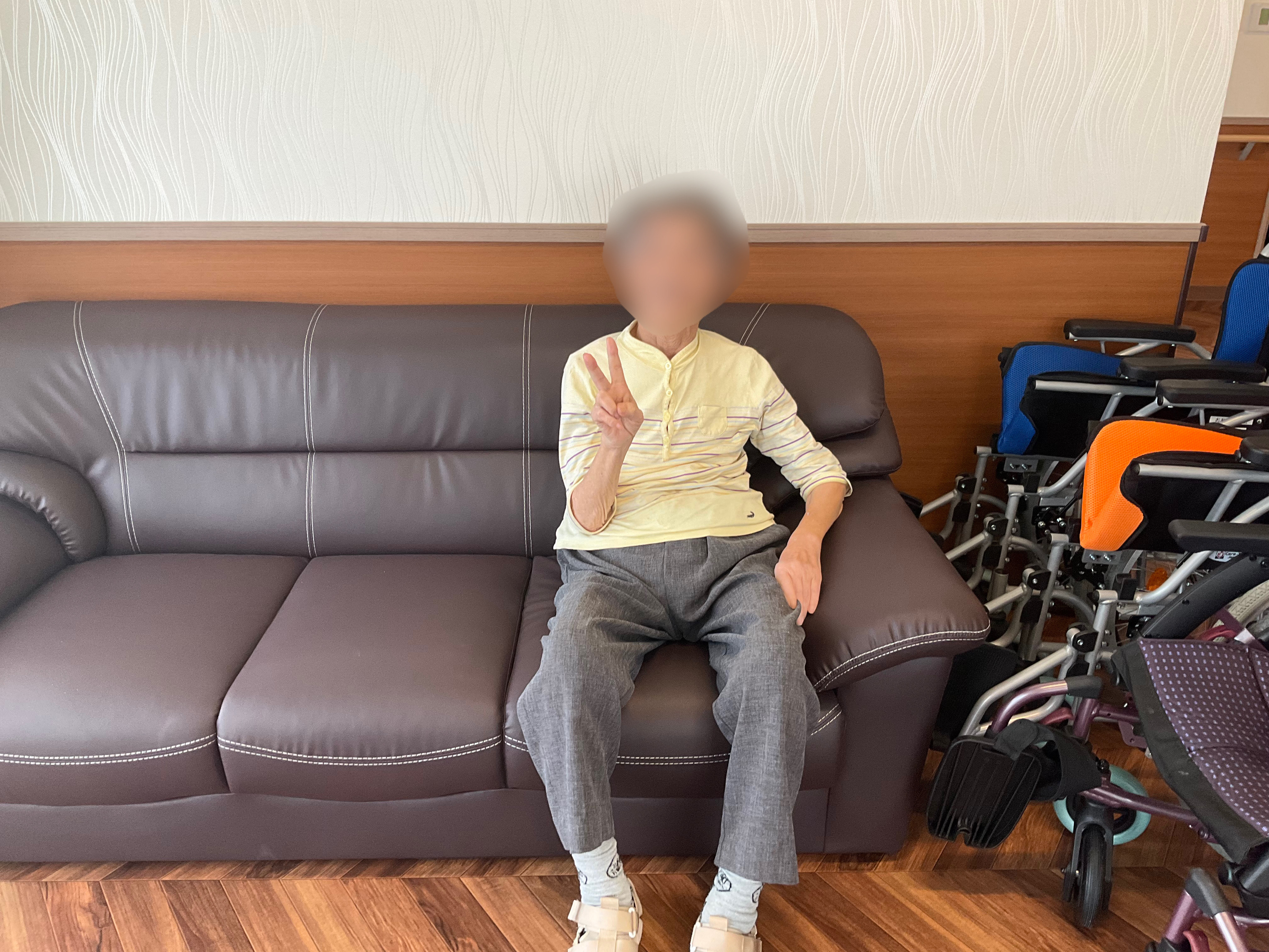 いつも車いすのO様ですが、ご本人希望で最近はソファーでくつろいでおられます☺