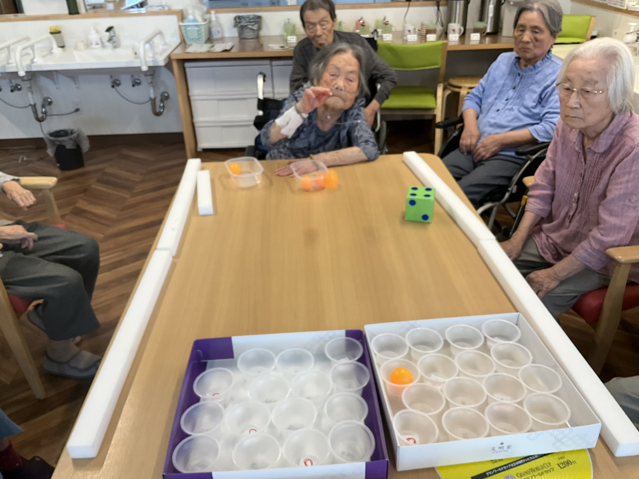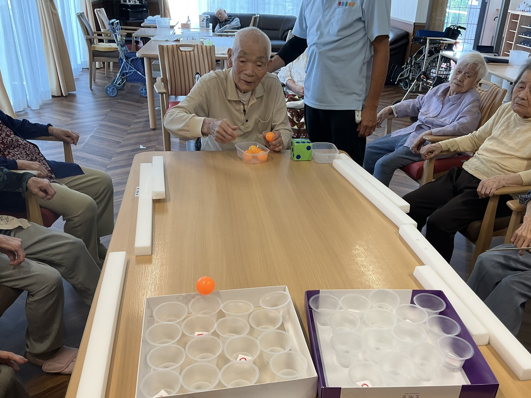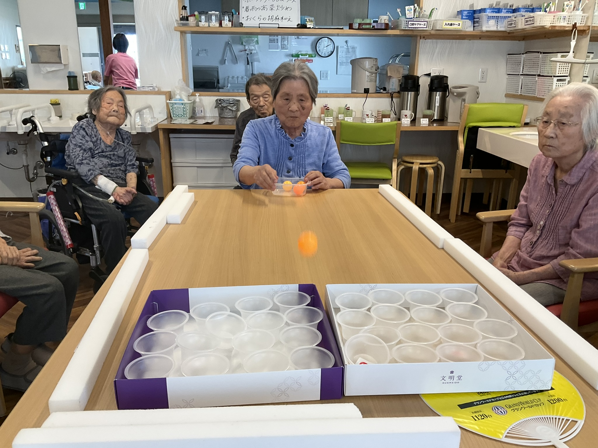 ピンポン玉をバウンドさせて、並べられたカップの中に入れるゲームです♪