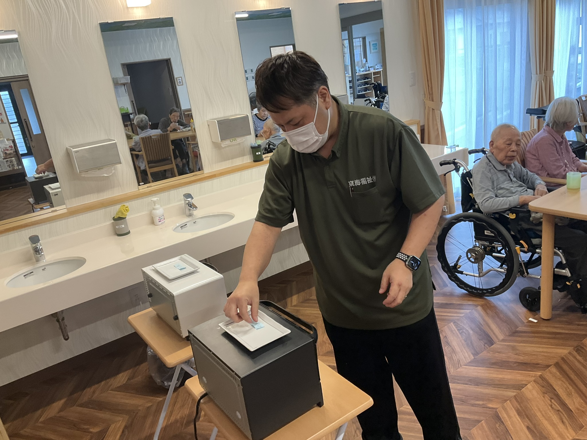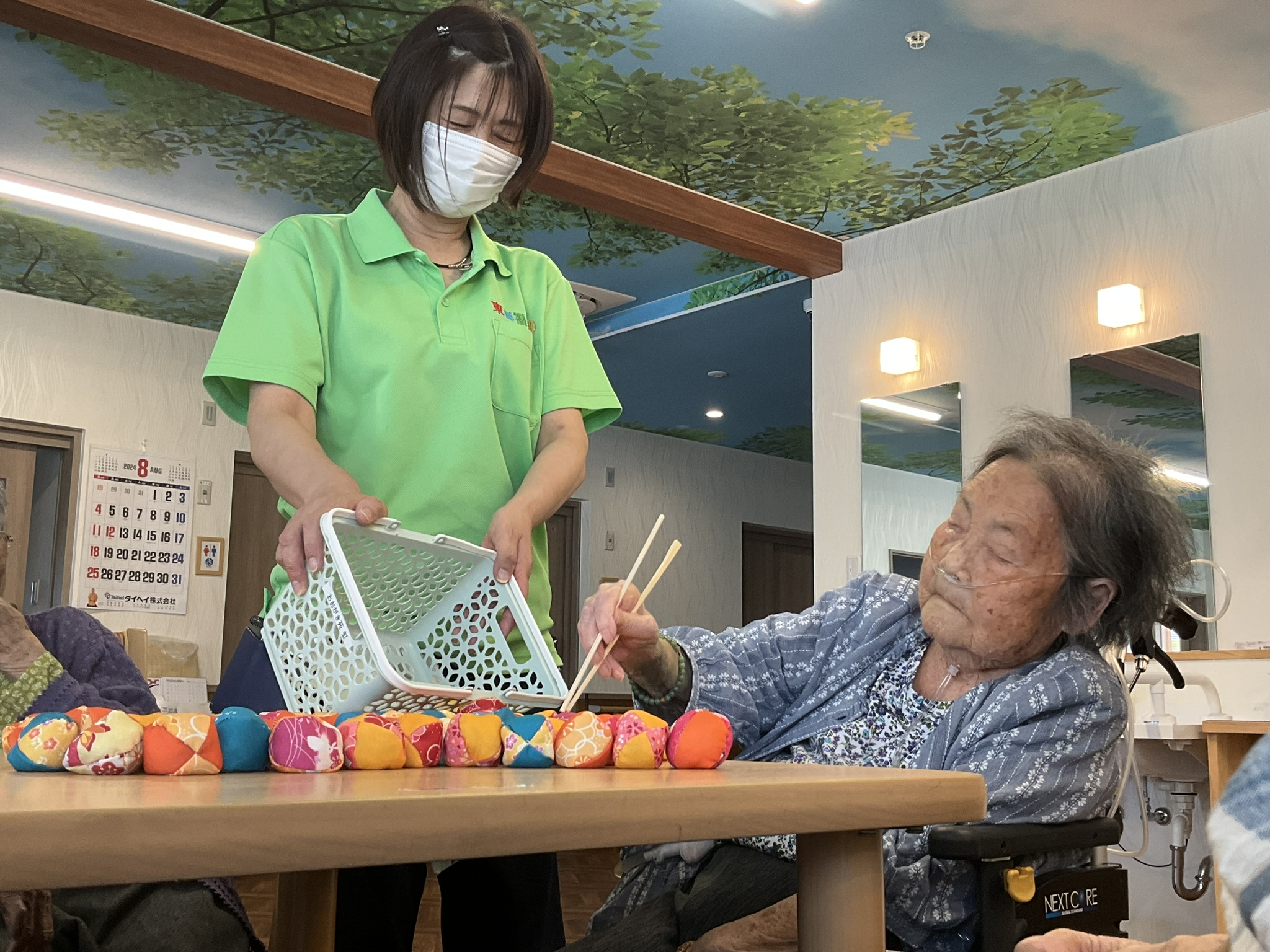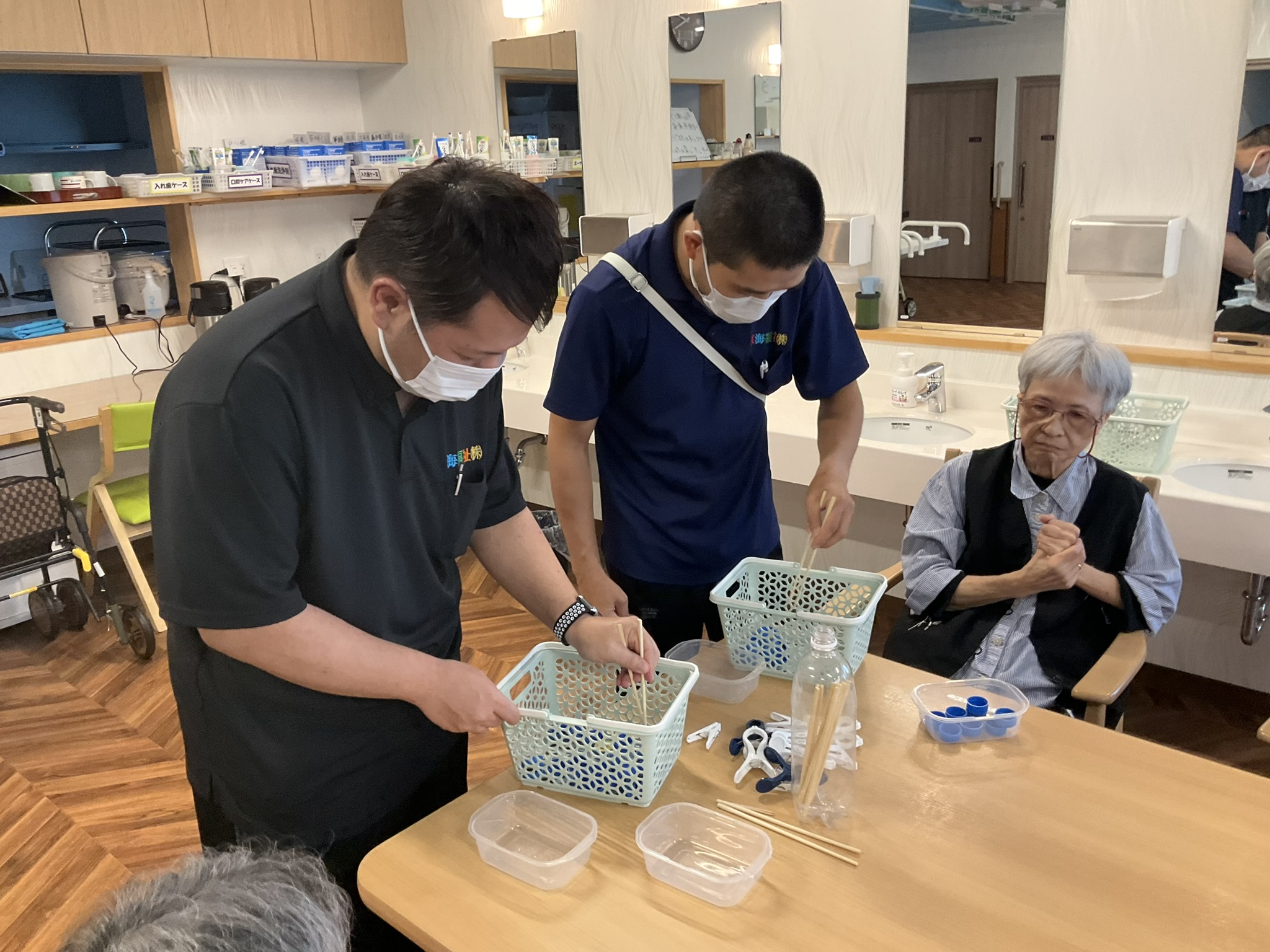 そんな様子を後ろで見ていたら、「施設長は左手でやってみてください」とスタッフの声が。