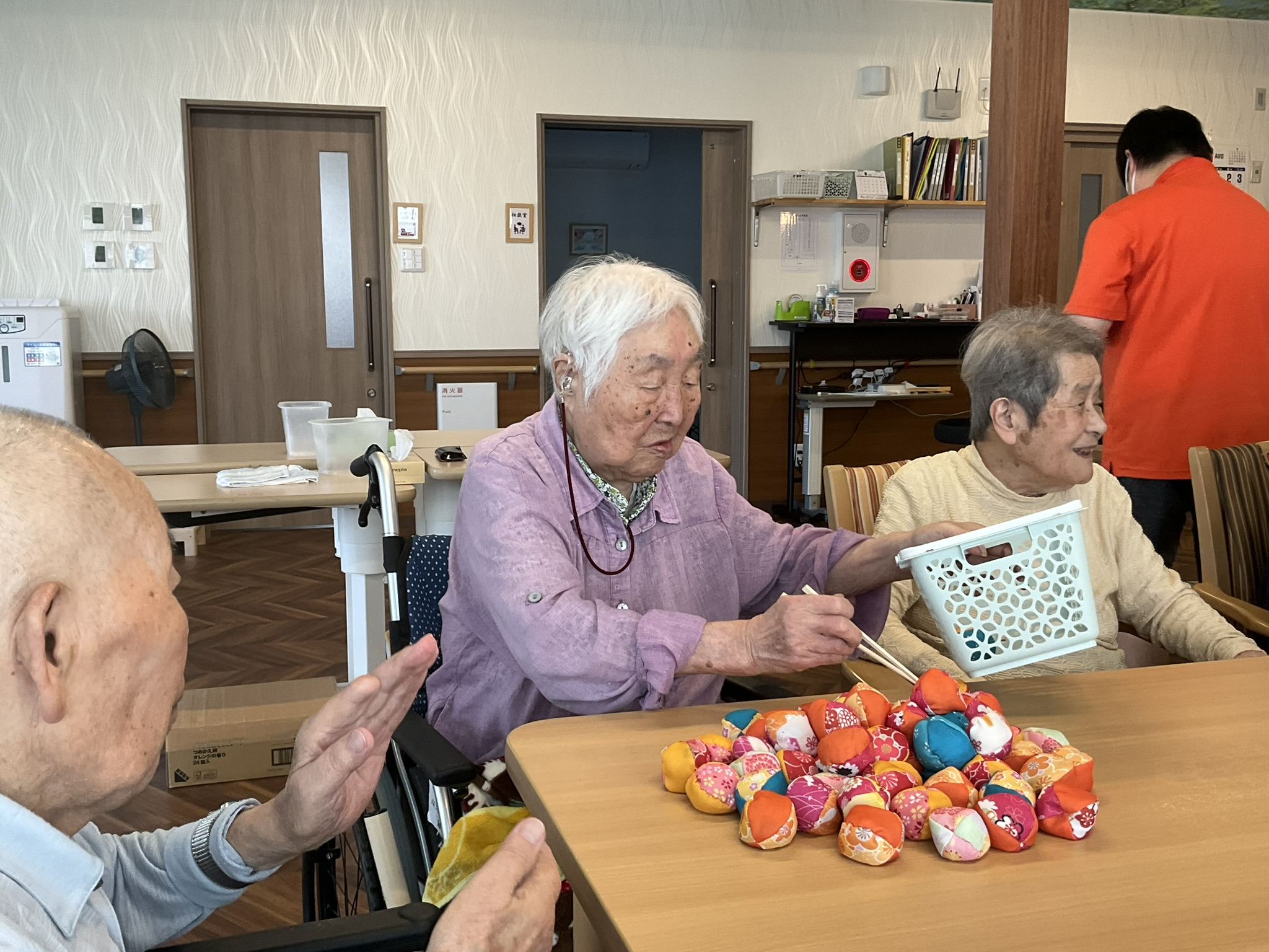 お手玉だと大きくて柔らかいので掴みやすいですね。これは準備運動です。後日、同じく箸を使った難しいゲームを実施します(*^^)v