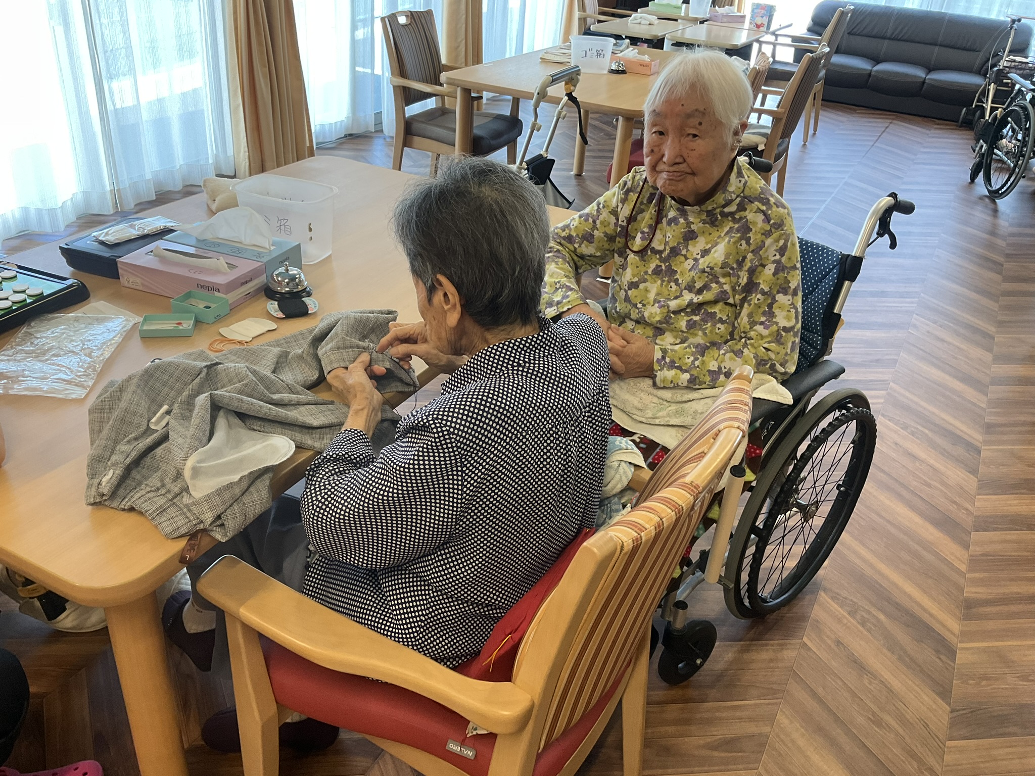 利用者様の中に裁縫が得意な方がいらっしゃいまして、今日はご自身のズボンの裾上げをしていました。