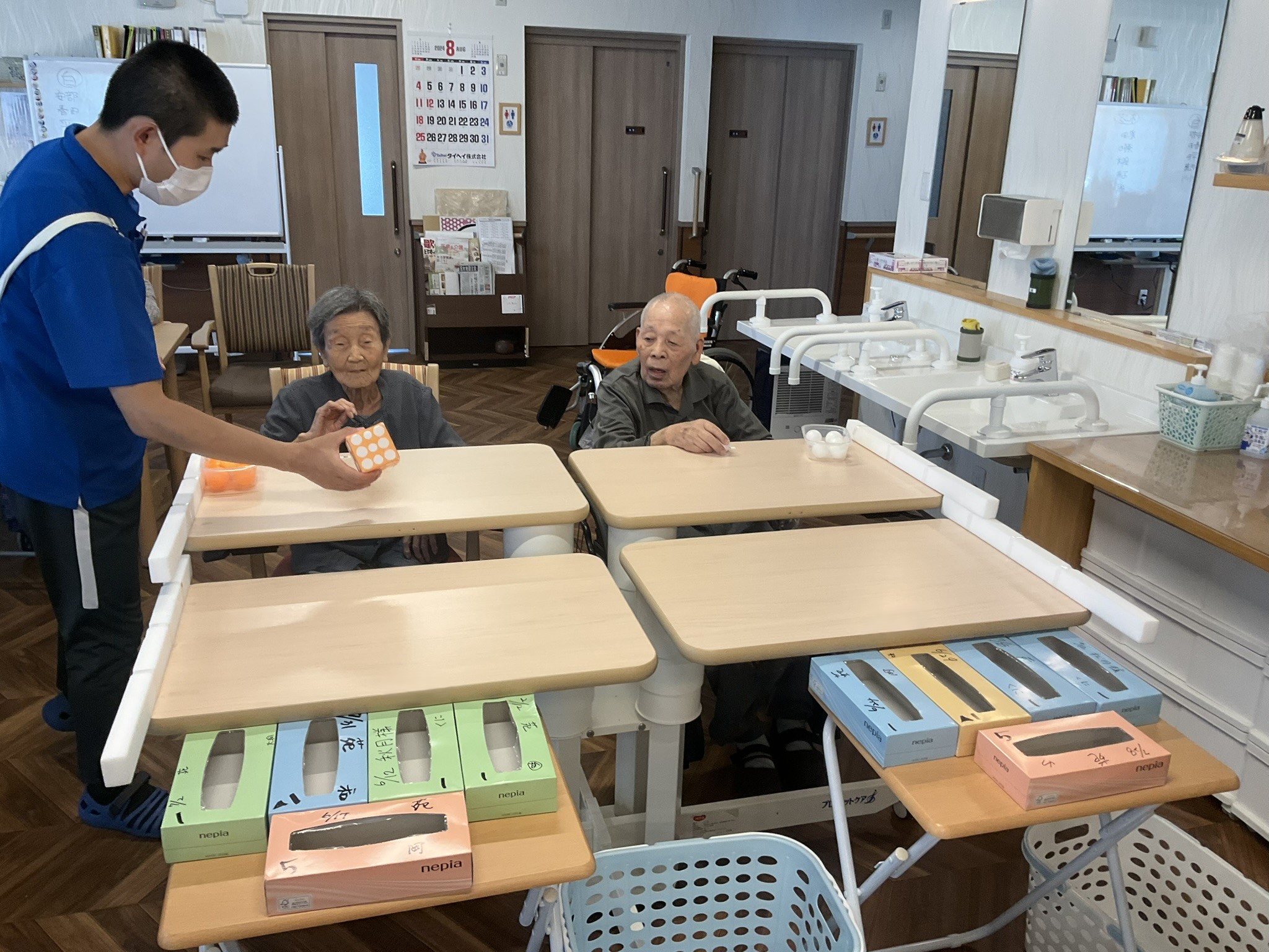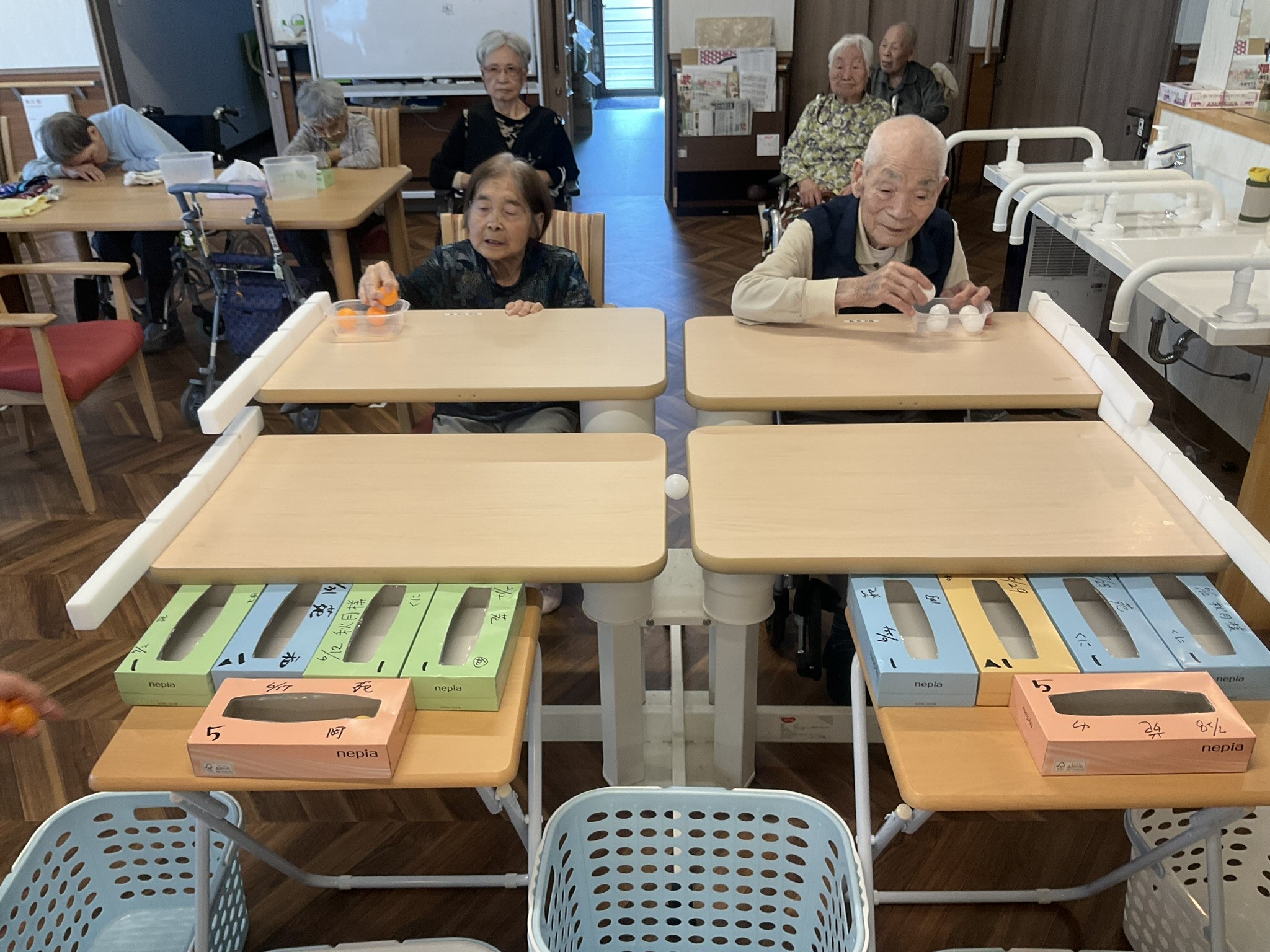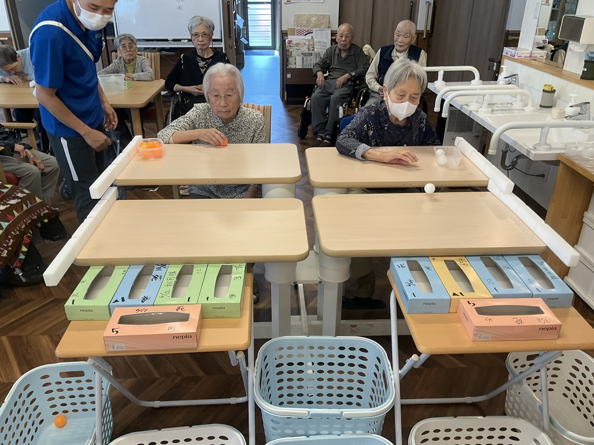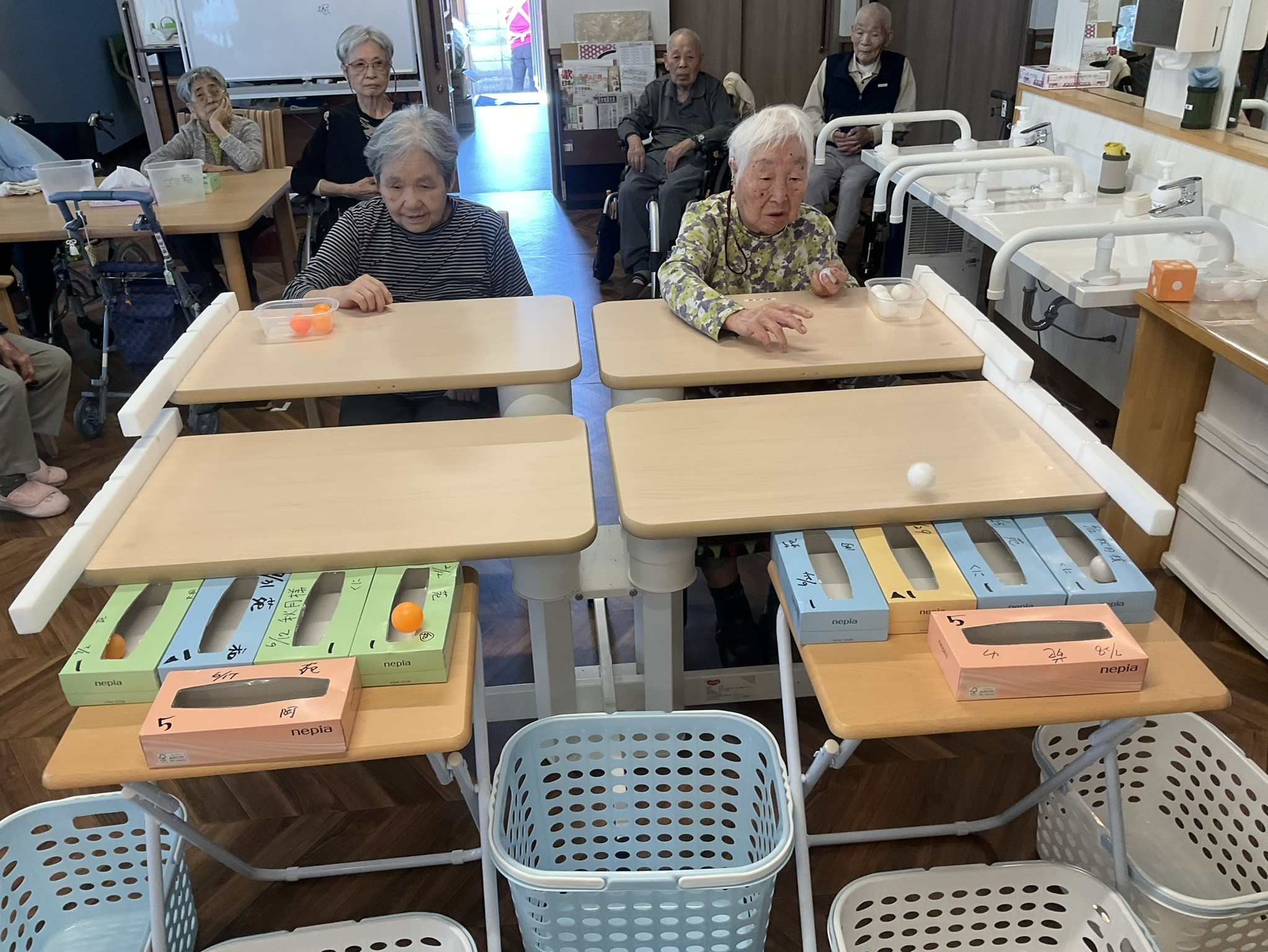 本日はティッシュの空き箱とピンポン玉を使用して、玉入れゲームを実施しました!