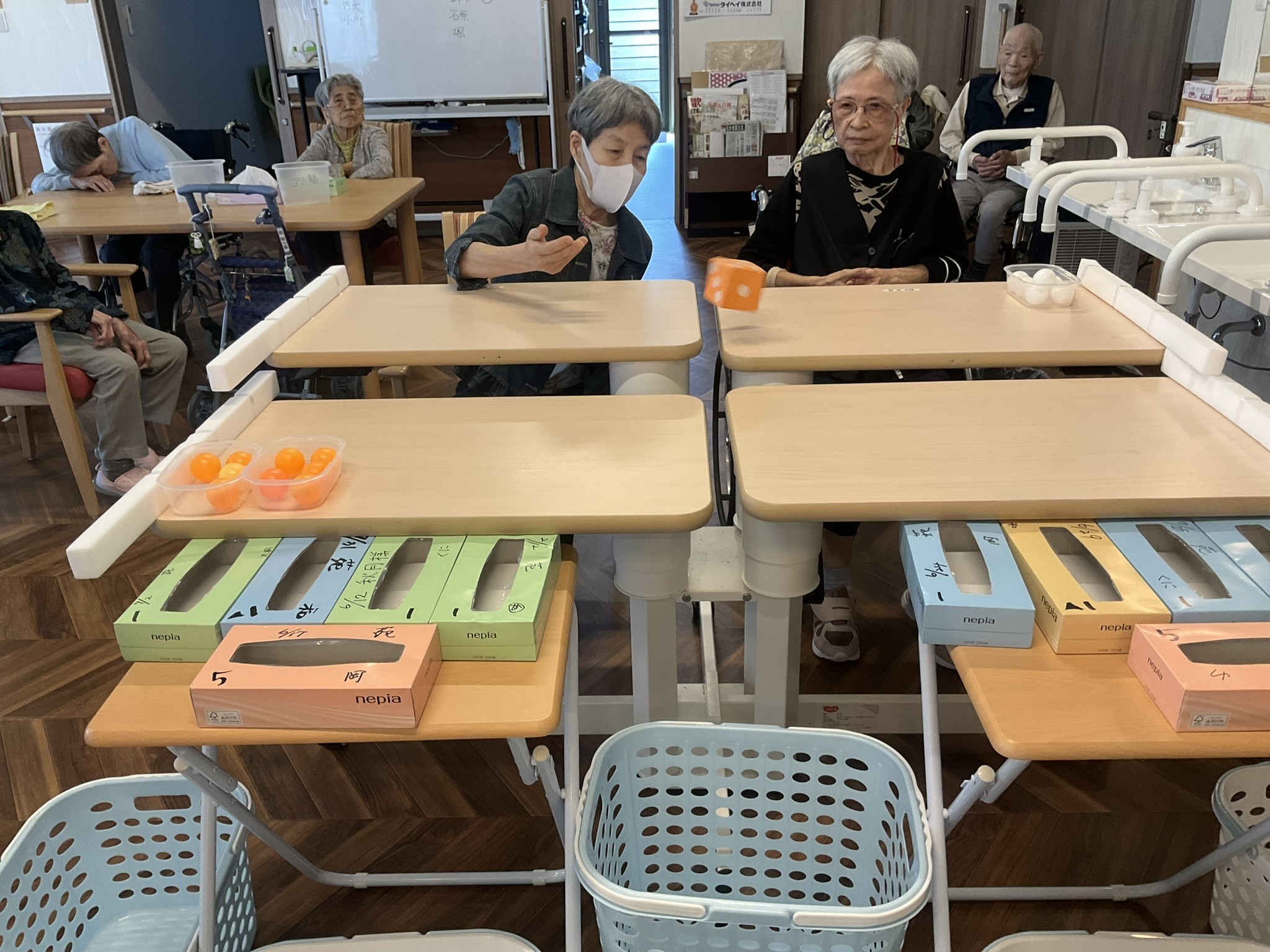 ティッシュの空き箱には点数が書いてあって、それに入れるゲームです。ティッシュの空き箱は口が狭くてなかなか入らないのですが、下にもたくさんかごが置いてあって、そこに入っても点数は入る仕組みです♪