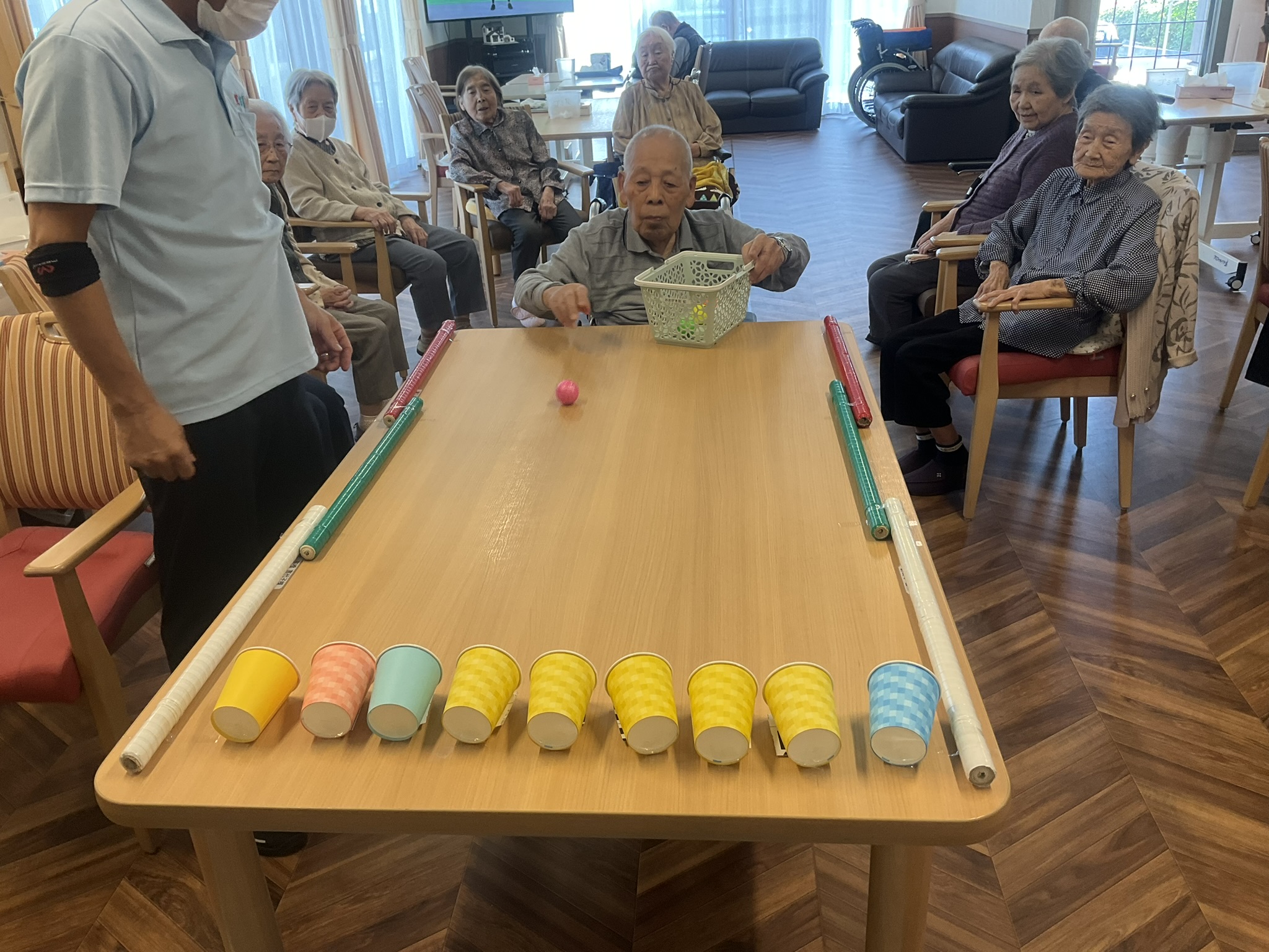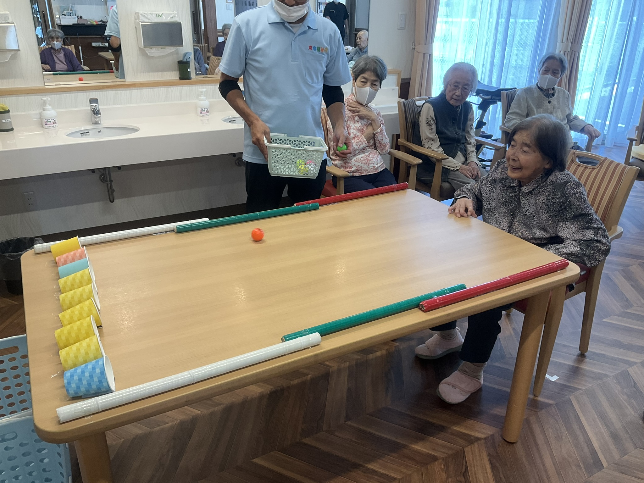 ボールを転がして紙コップに入れていくゲームなんですが、紙コップの一部がテーブルに固定されていまして、勢いよく紙コップにボールを入れると紙コップが立つようになっています。