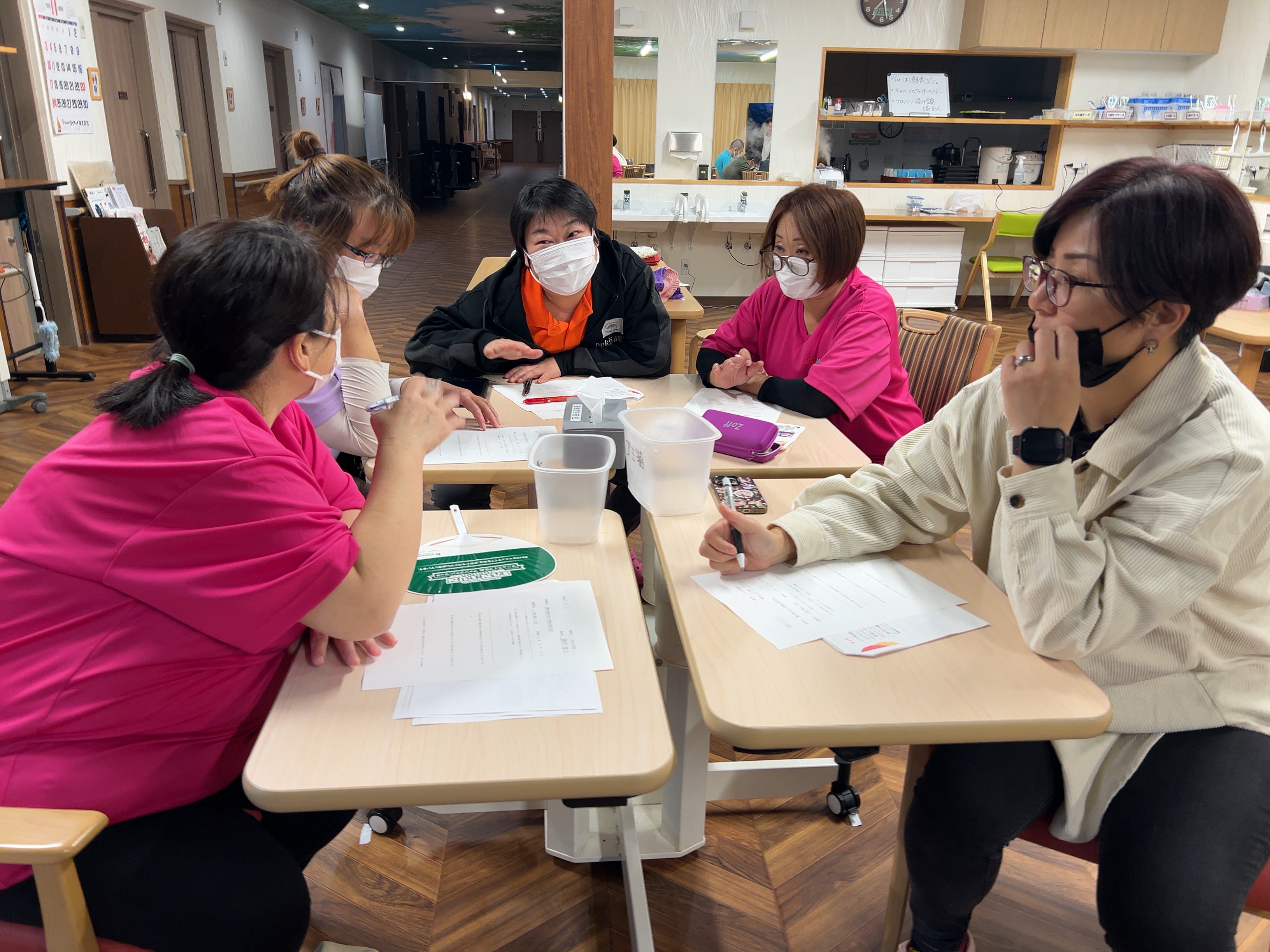 スタッフ全員ベテランなので一連の動作はわかっていますが、初心に戻り、抜けている部分などの修正を行います。こういった介護に関する情報は日々アップデートされていきます。昔は当たり前だった行為が今はNGだったりすることもたくさんあります。