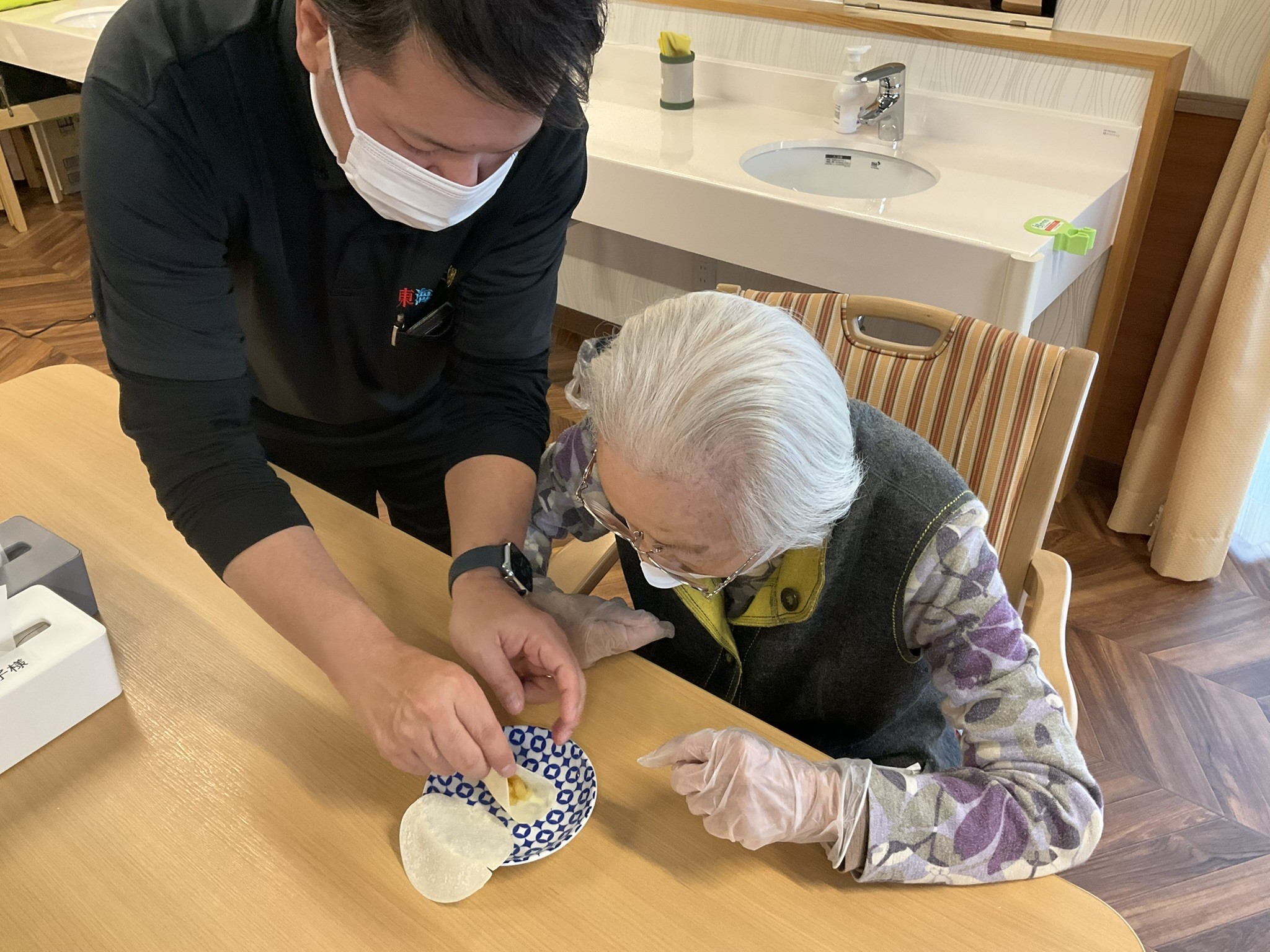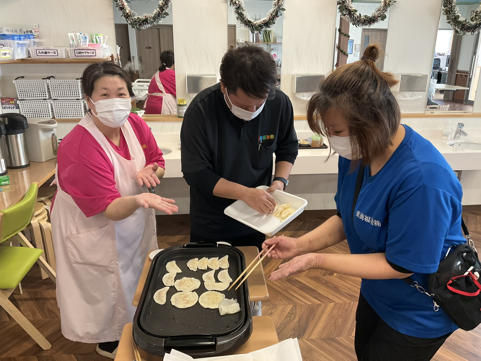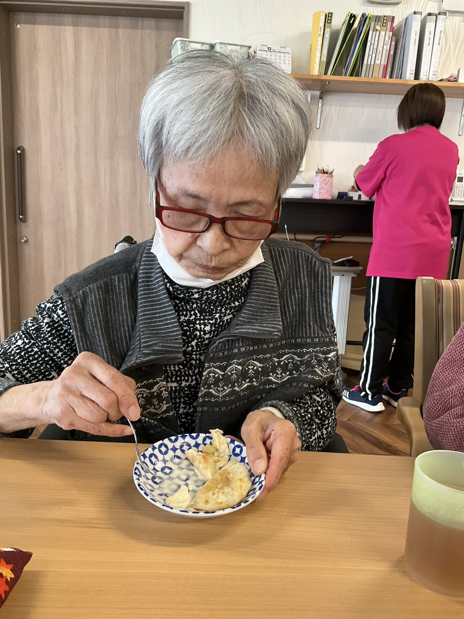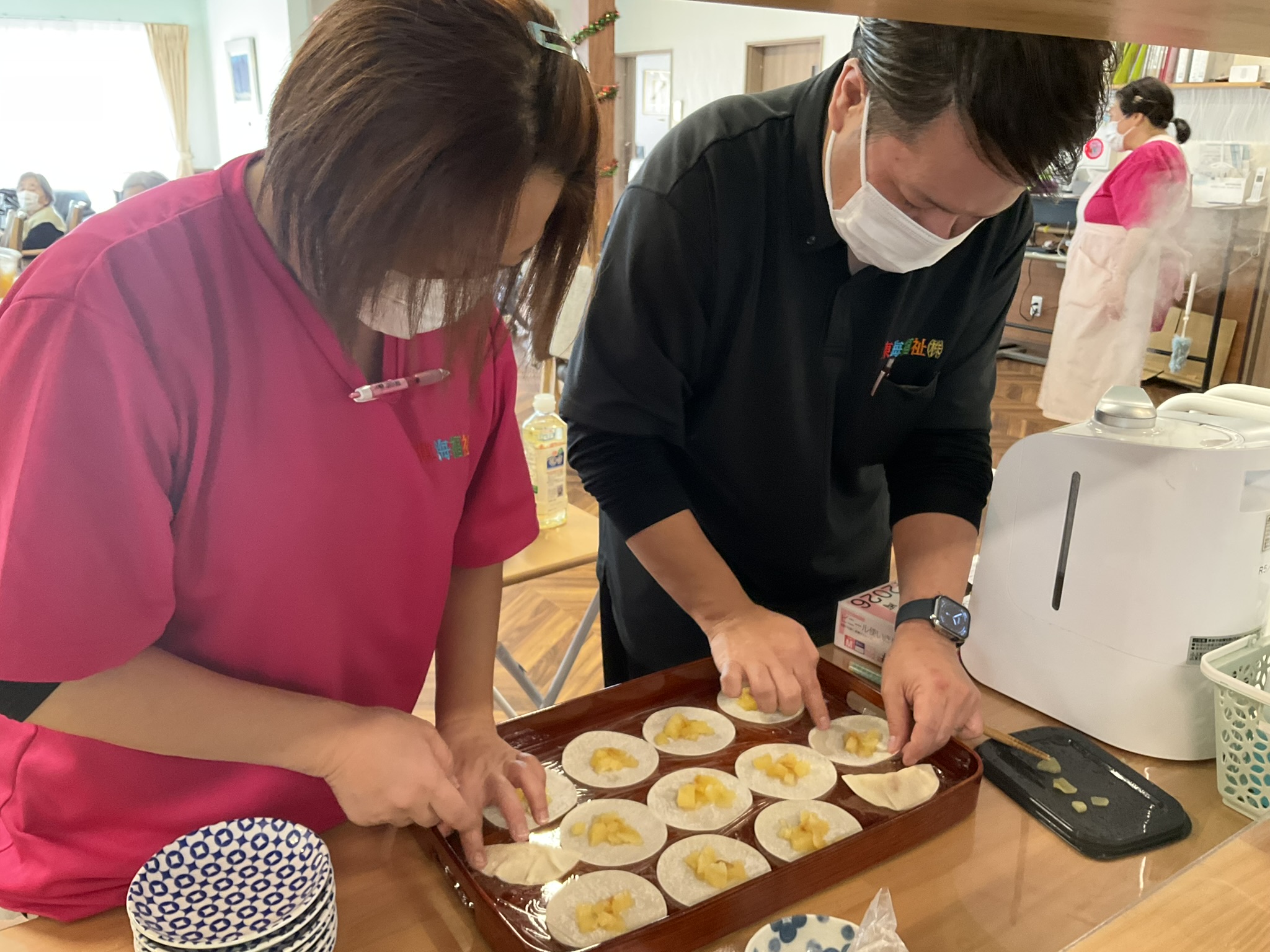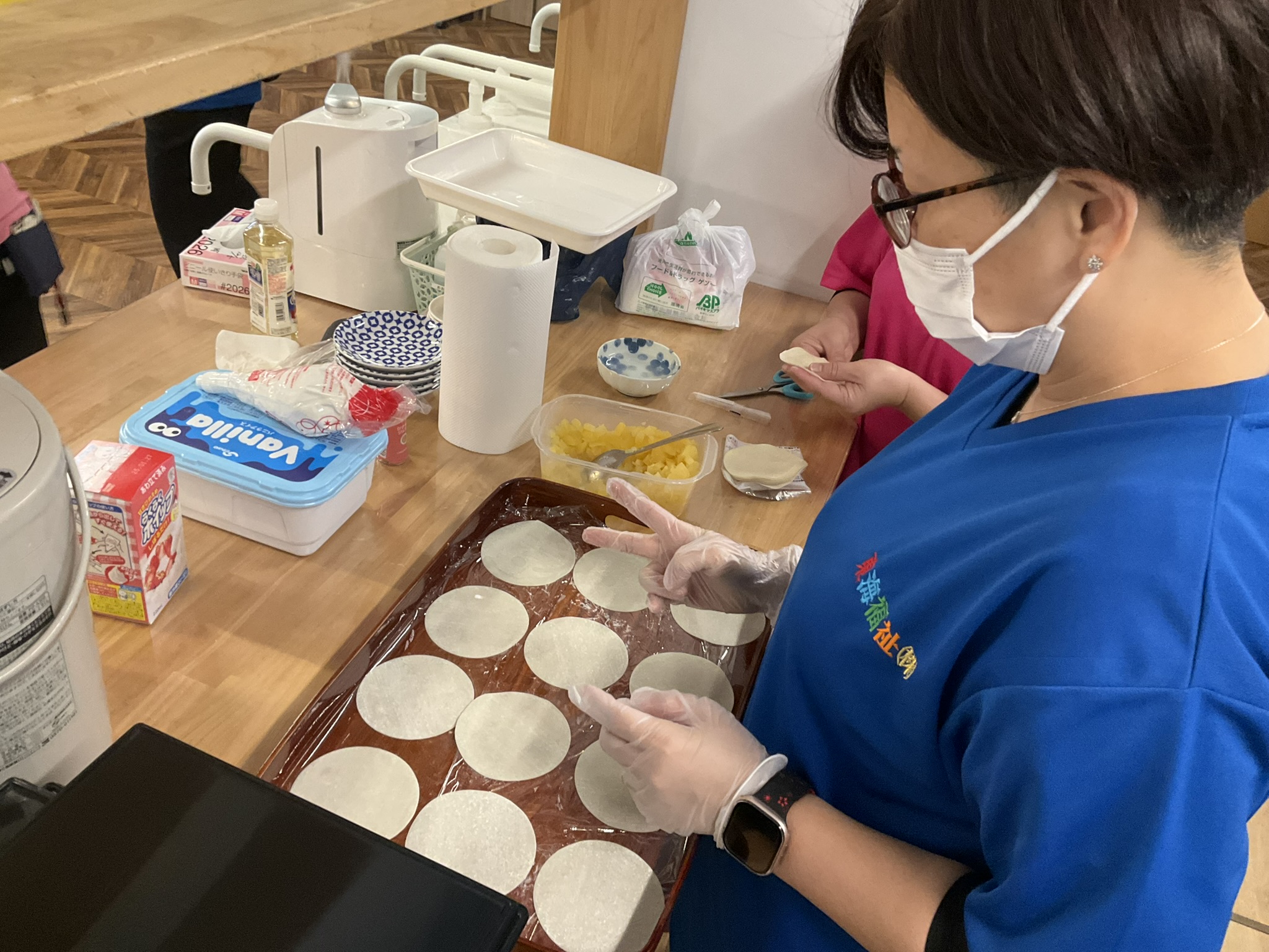 利用者様には餃子の皮にフルーツを包んでもらい、スタッフが焼きます。