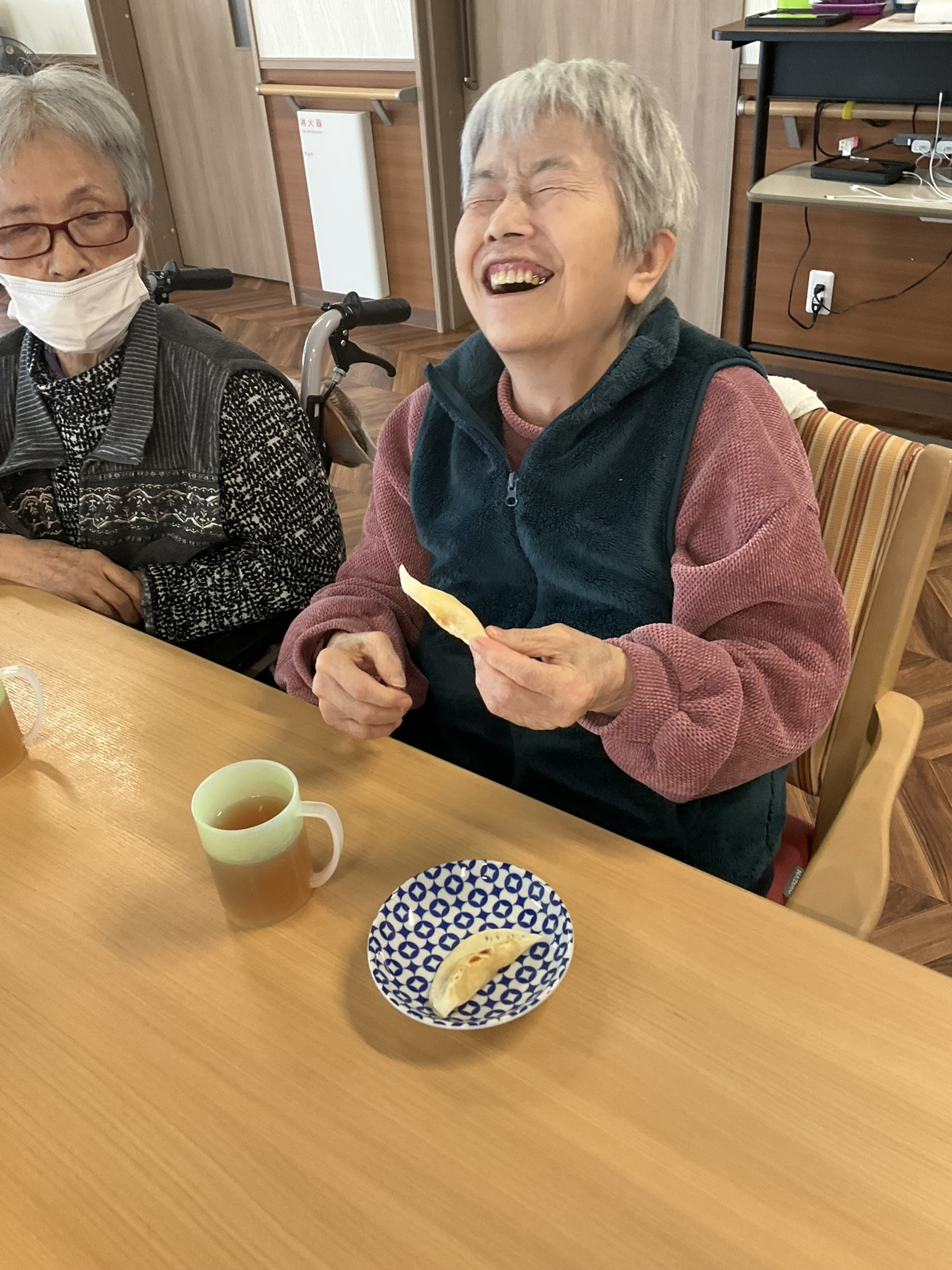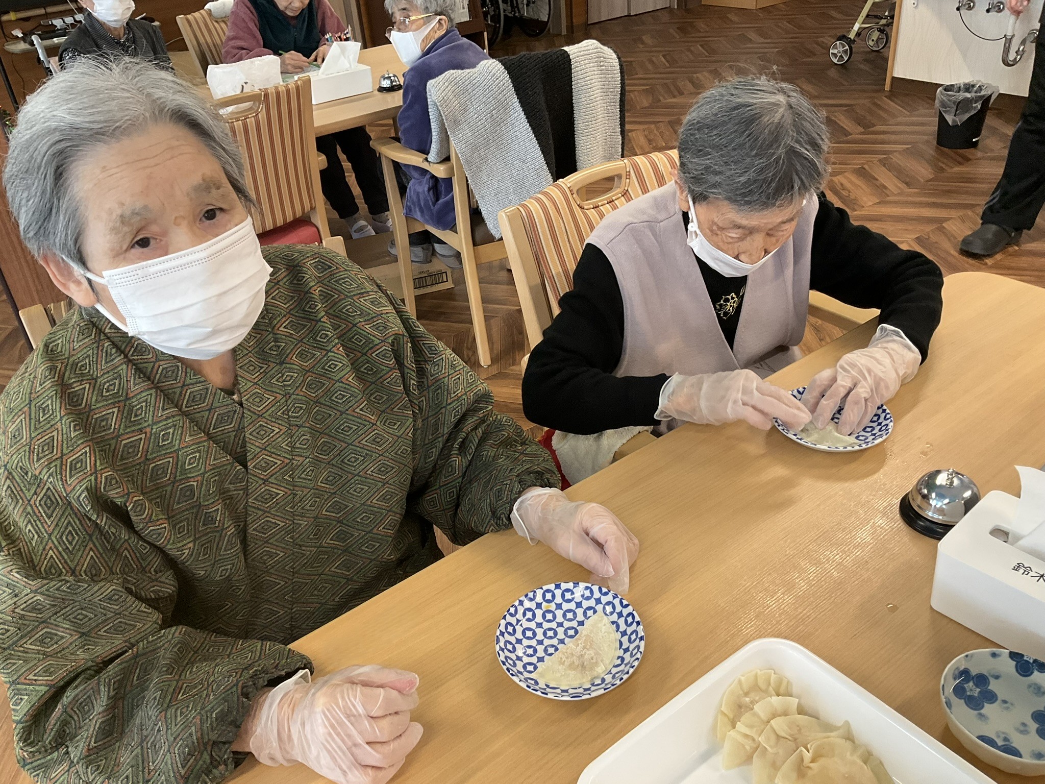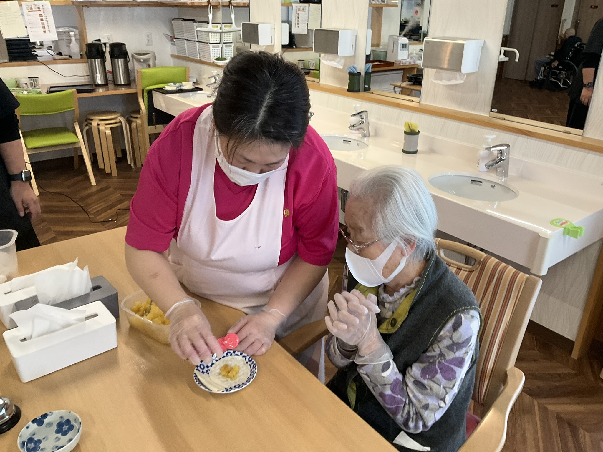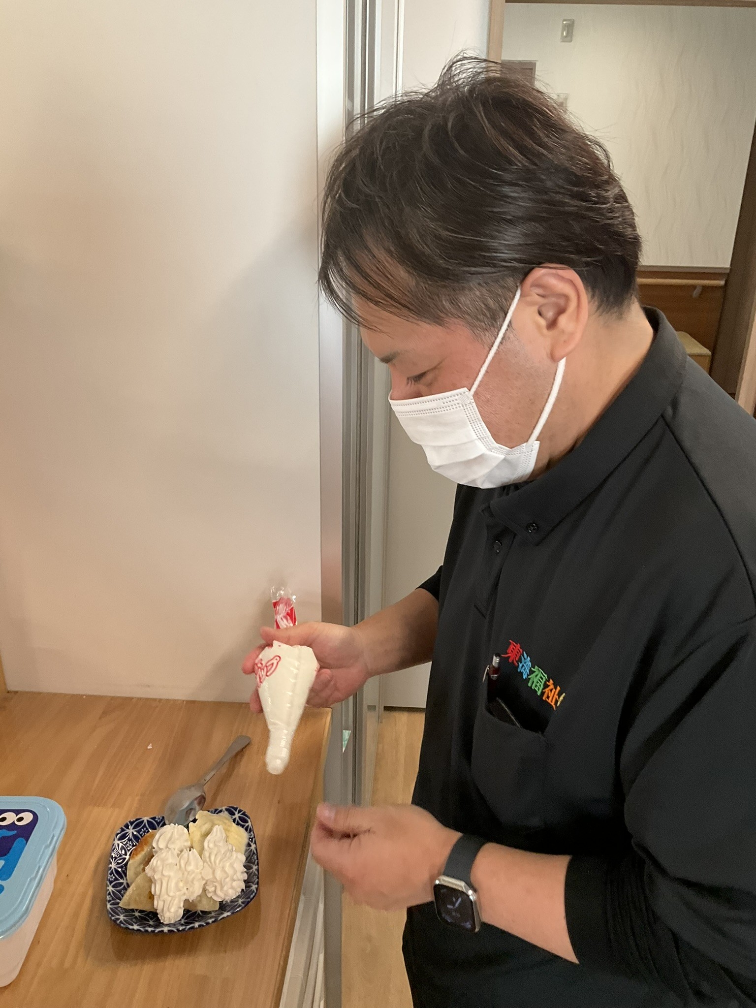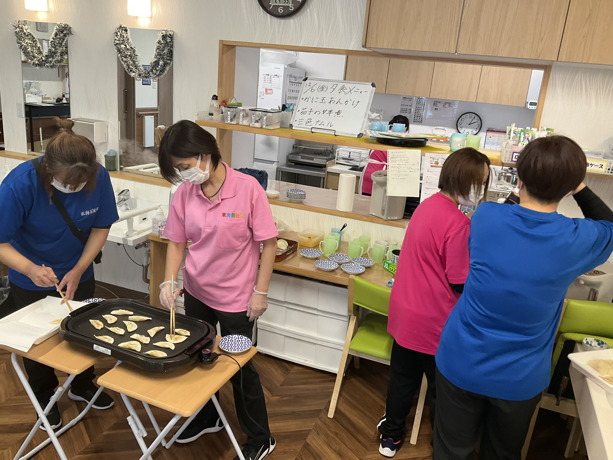 利用者様には餃子の皮にフルーツを包んでもらい、スタッフが焼きます。