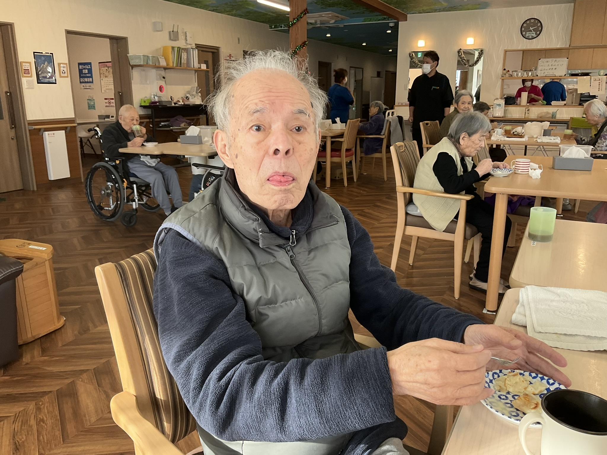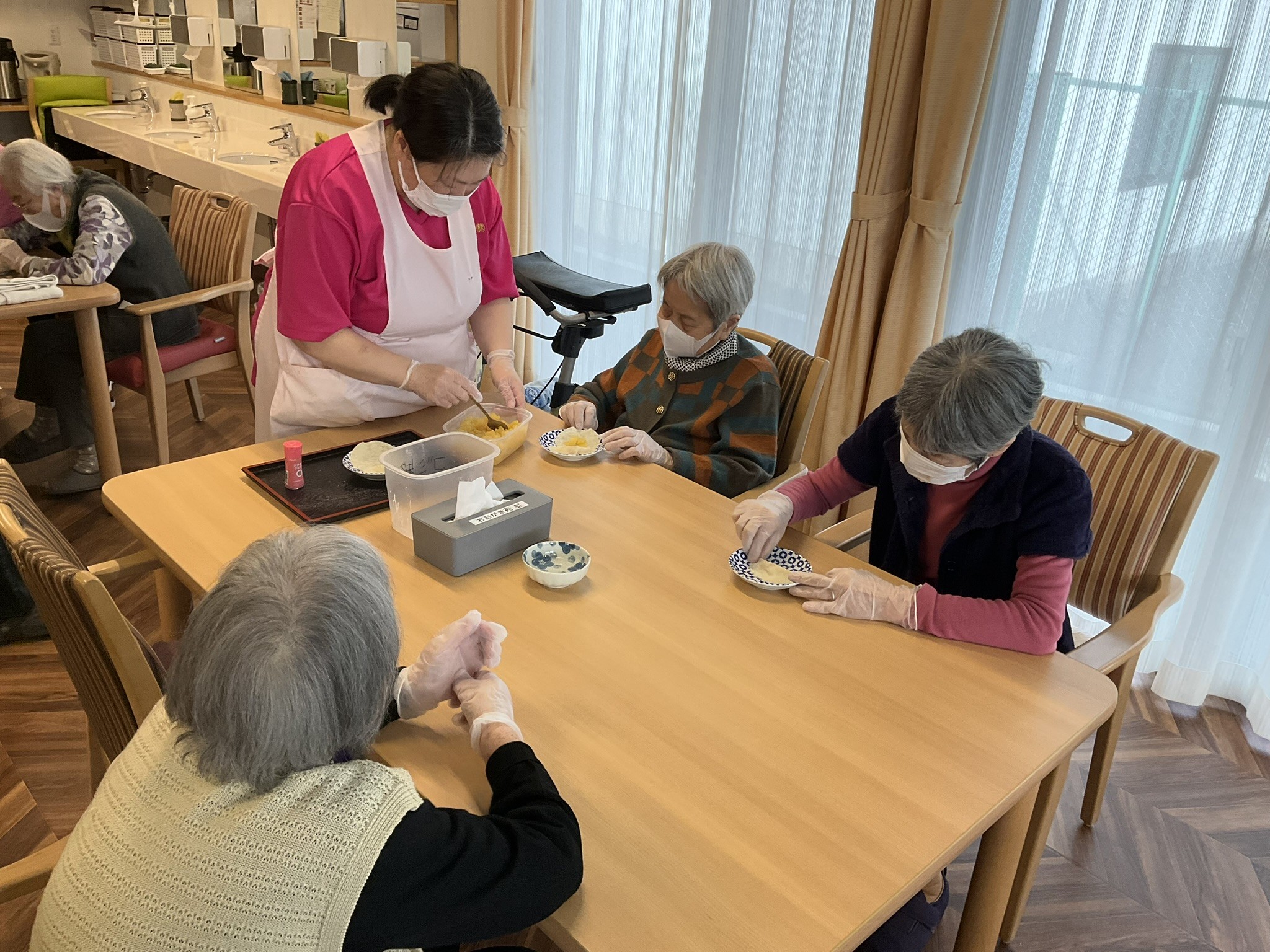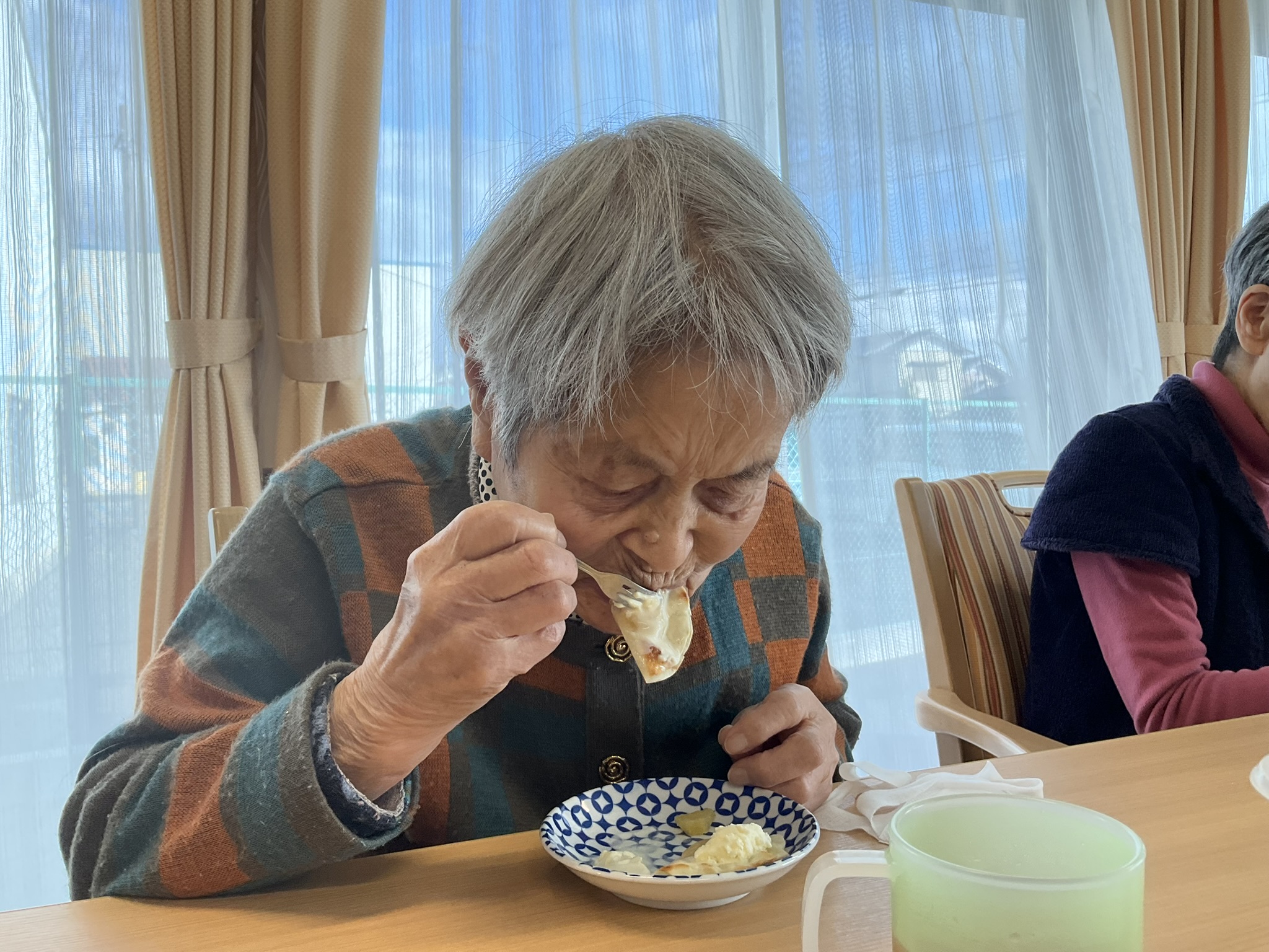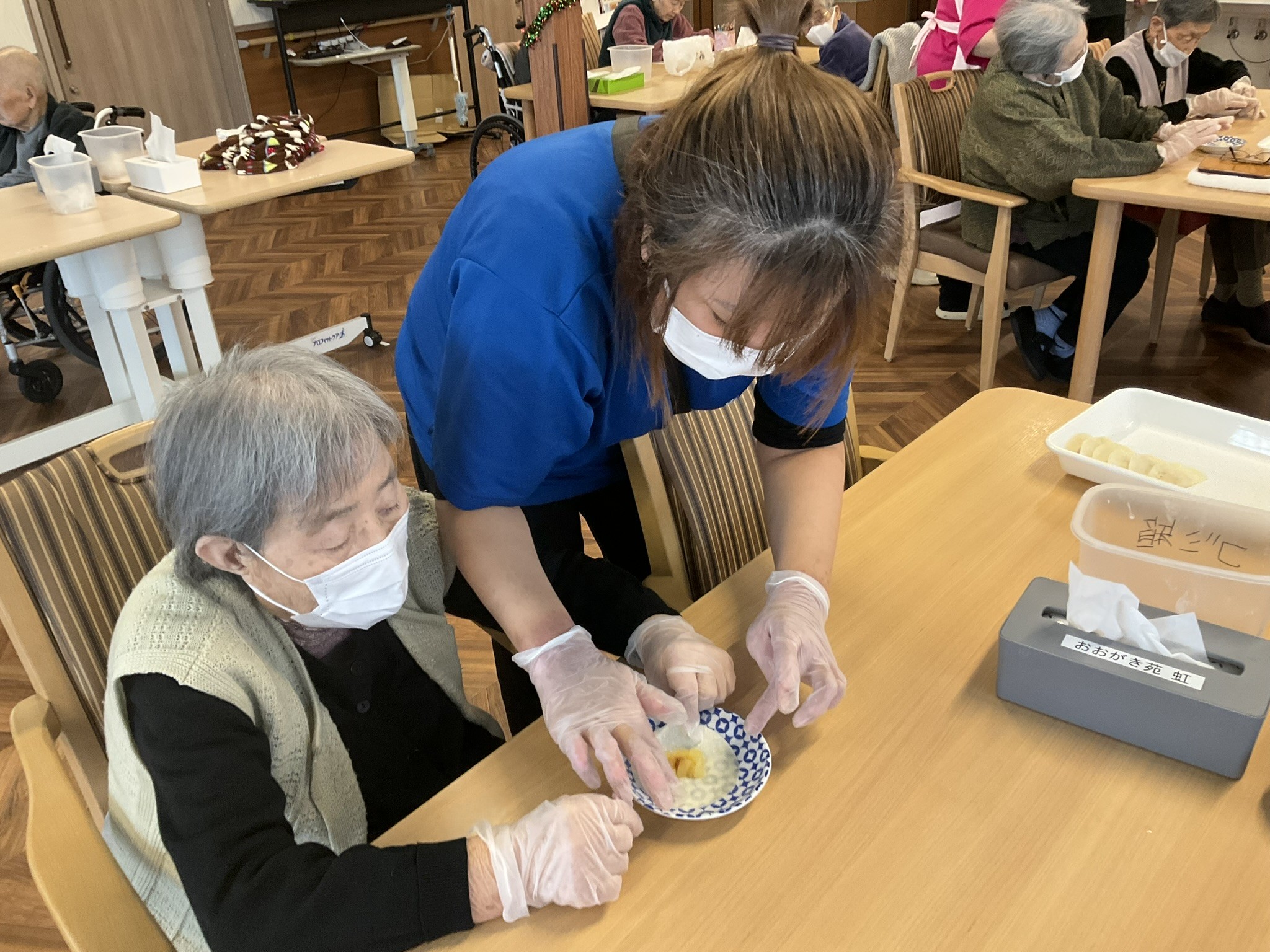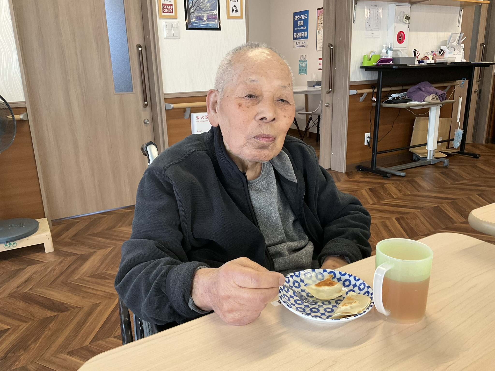 利用者様には餃子の皮にフルーツを包んでもらい、スタッフが焼きます。