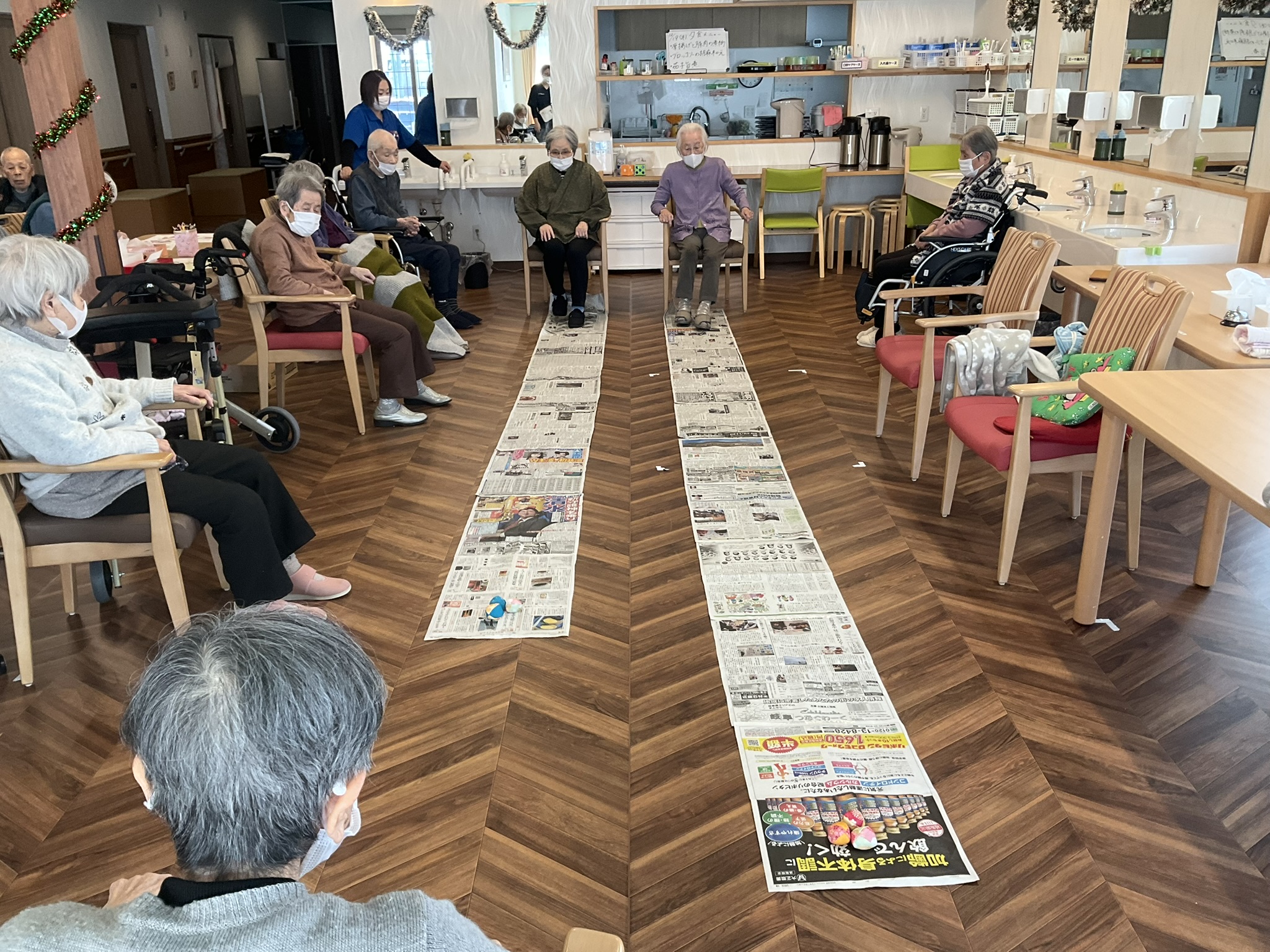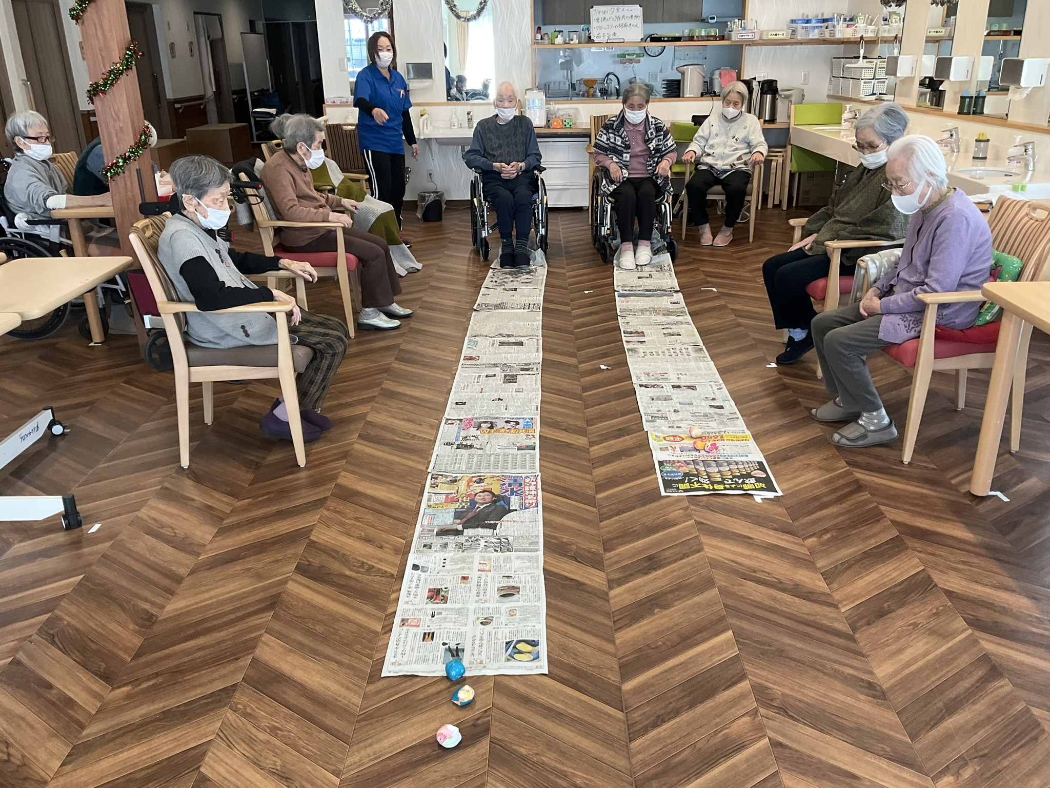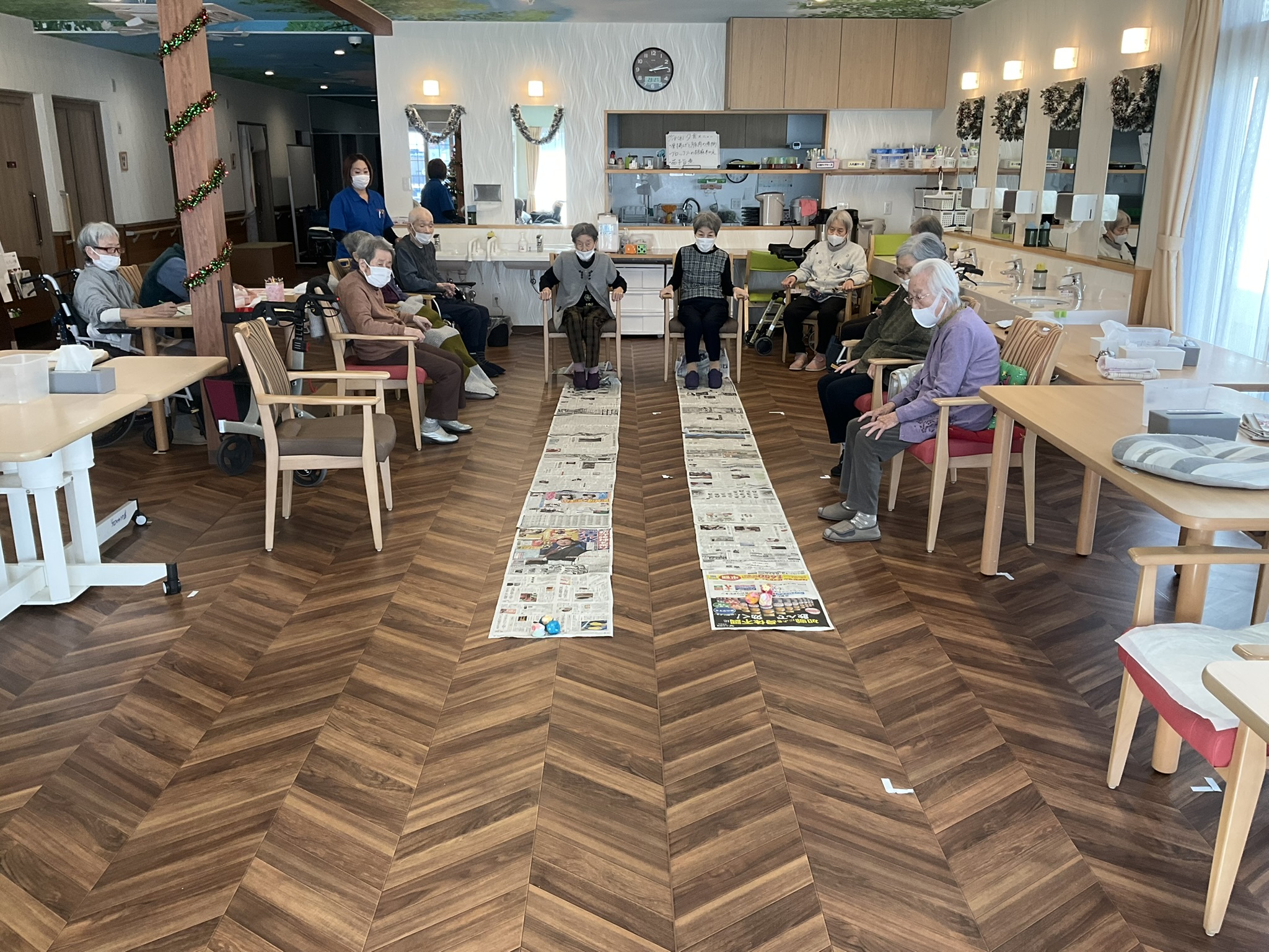 本日は、長い新聞紙にお手玉を乗せて、それを落とさないように足で手前にたぐり寄せるゲームを実施しました!