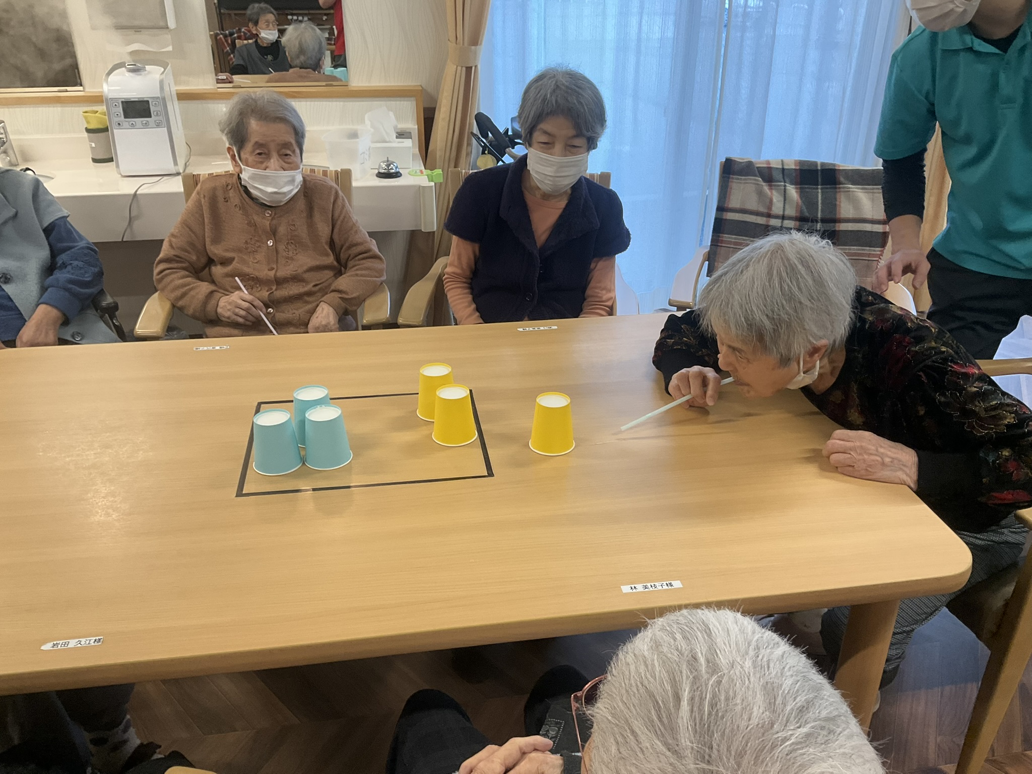 紙コップを逆さまにし、それをストローで吹いて枠の中に入れます。で、枠の中に入っている数が多い方が勝ちというルールです☆彡