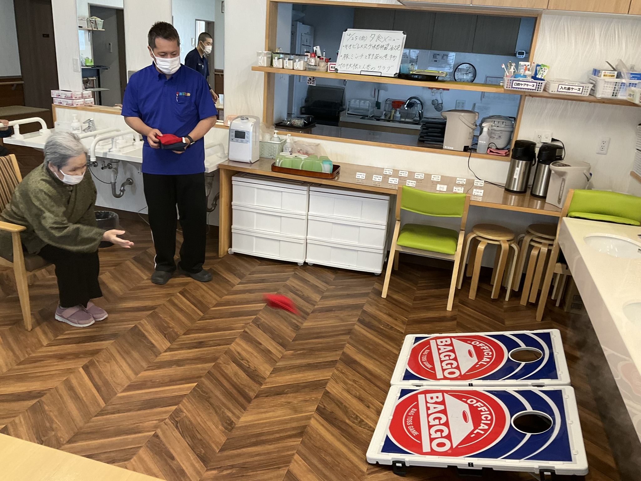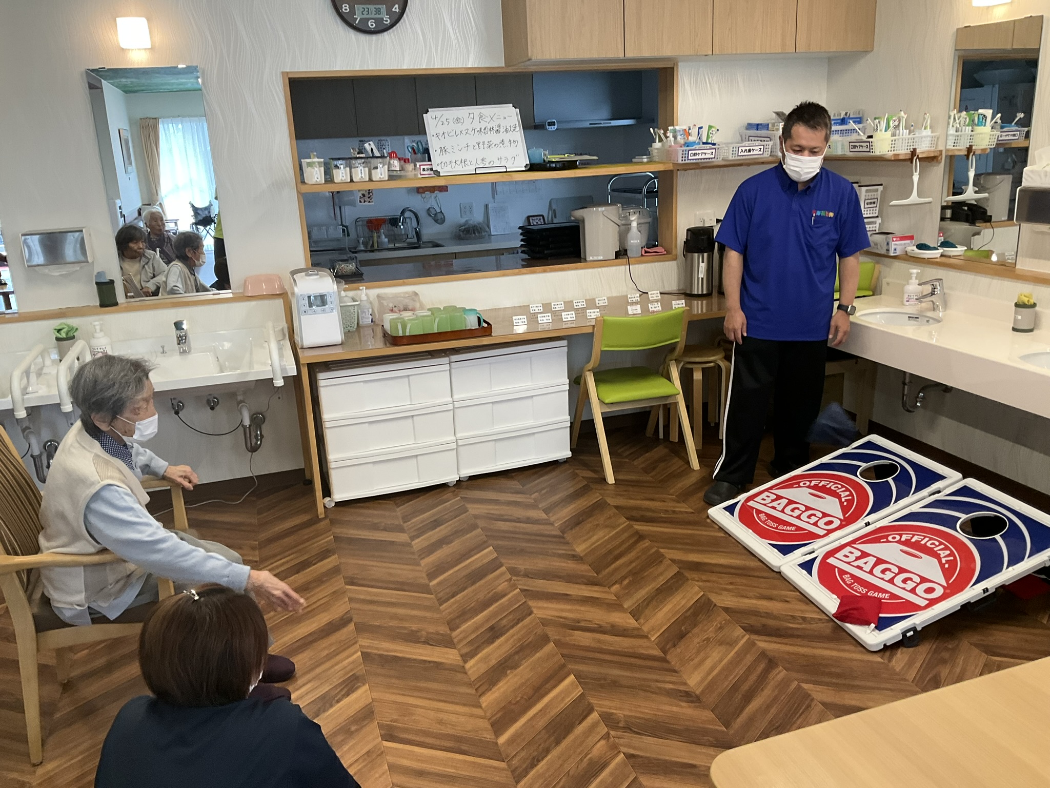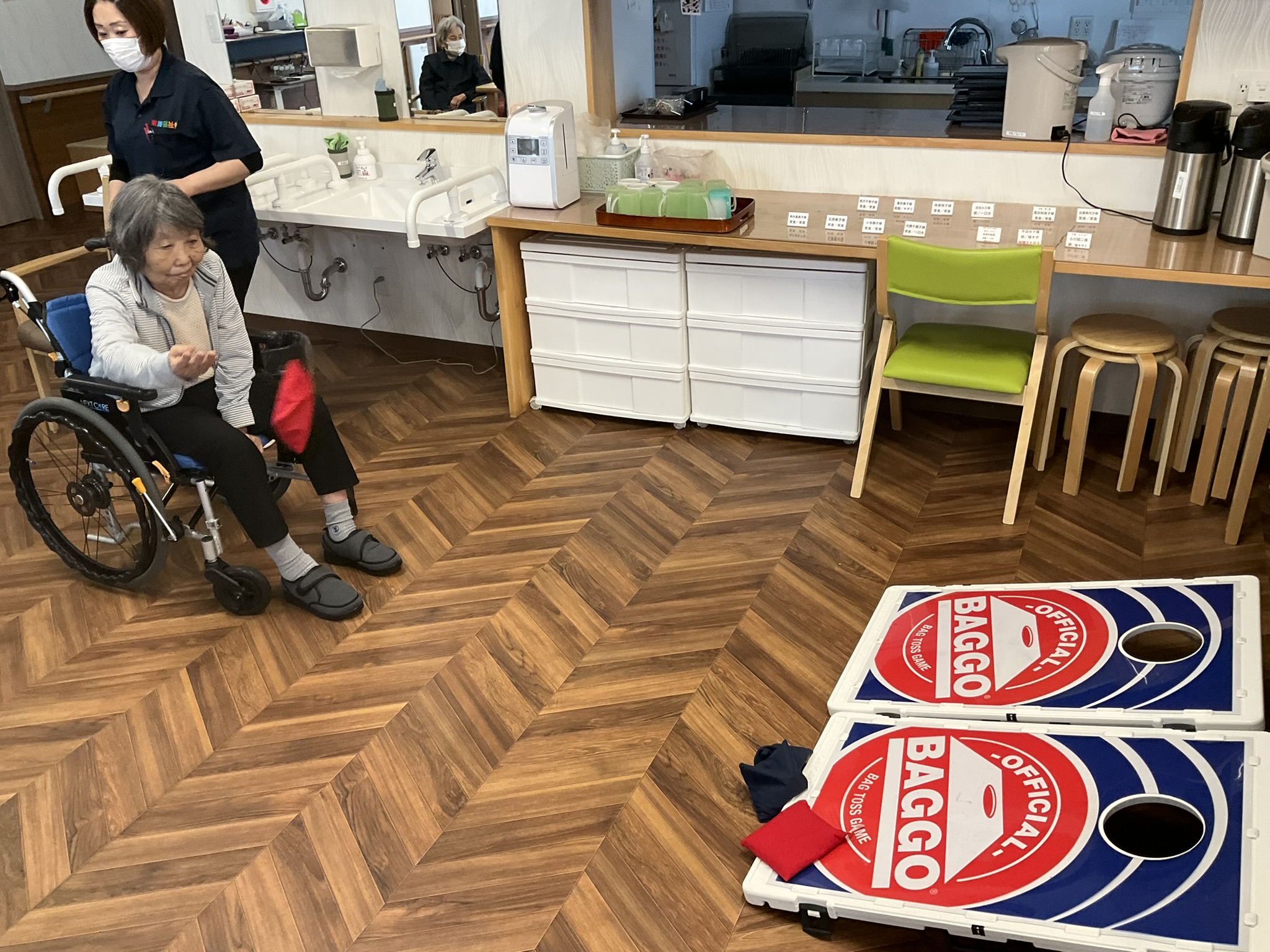 一か所に穴が開いているボードにビーンバッグを投げ、ボードに乗ったら1点、穴に入ったら3点を獲得できるゲームです。
