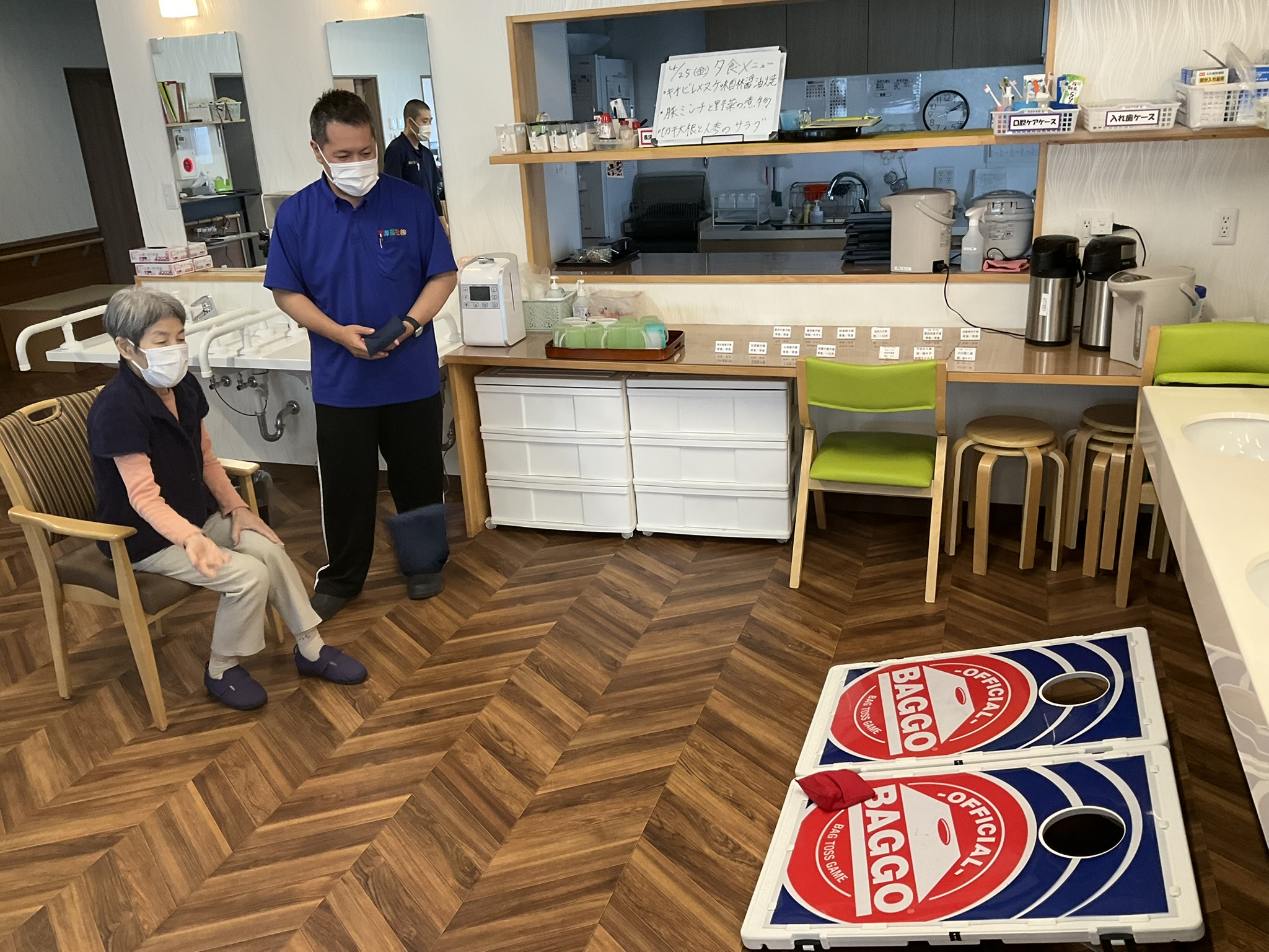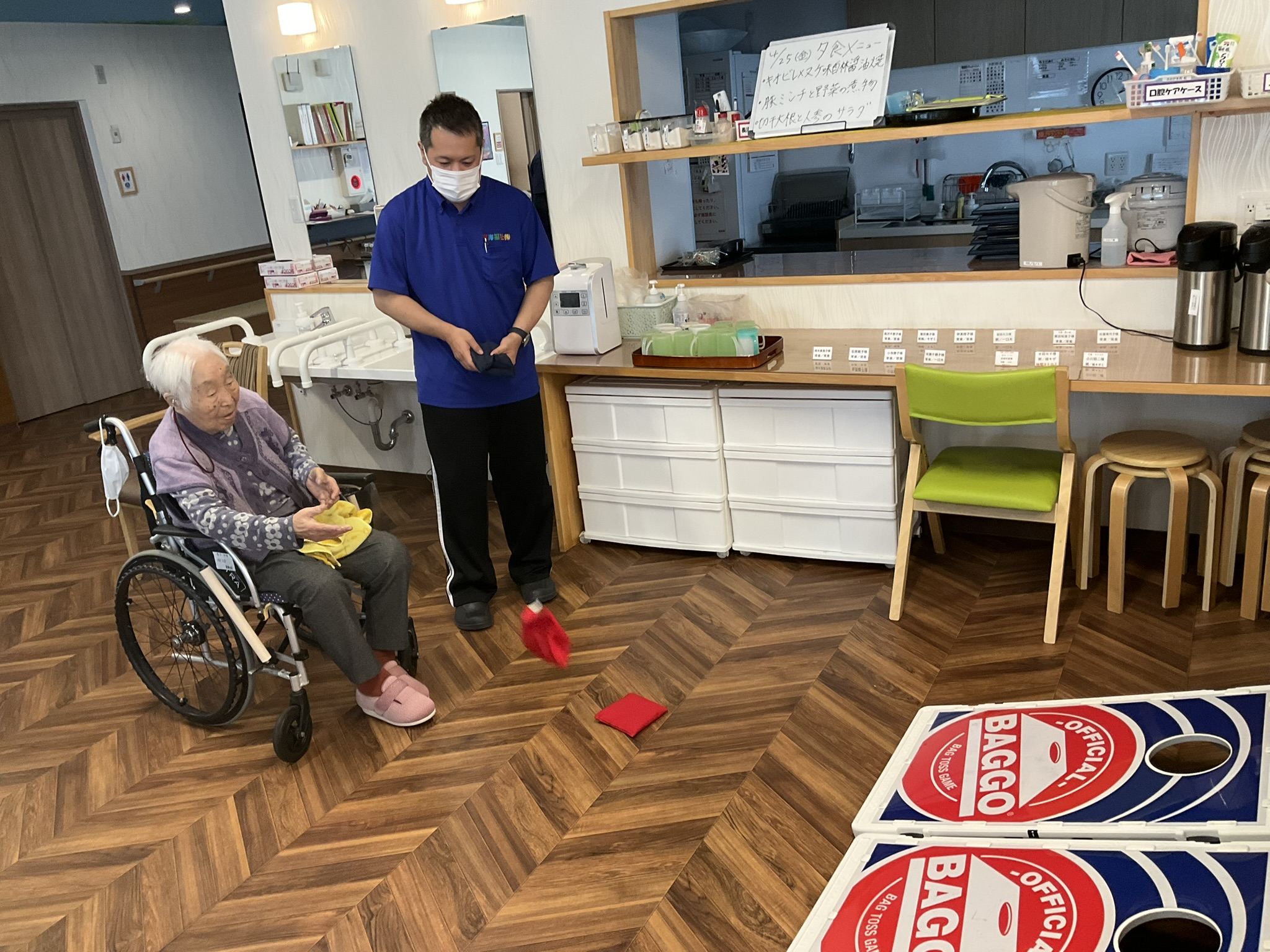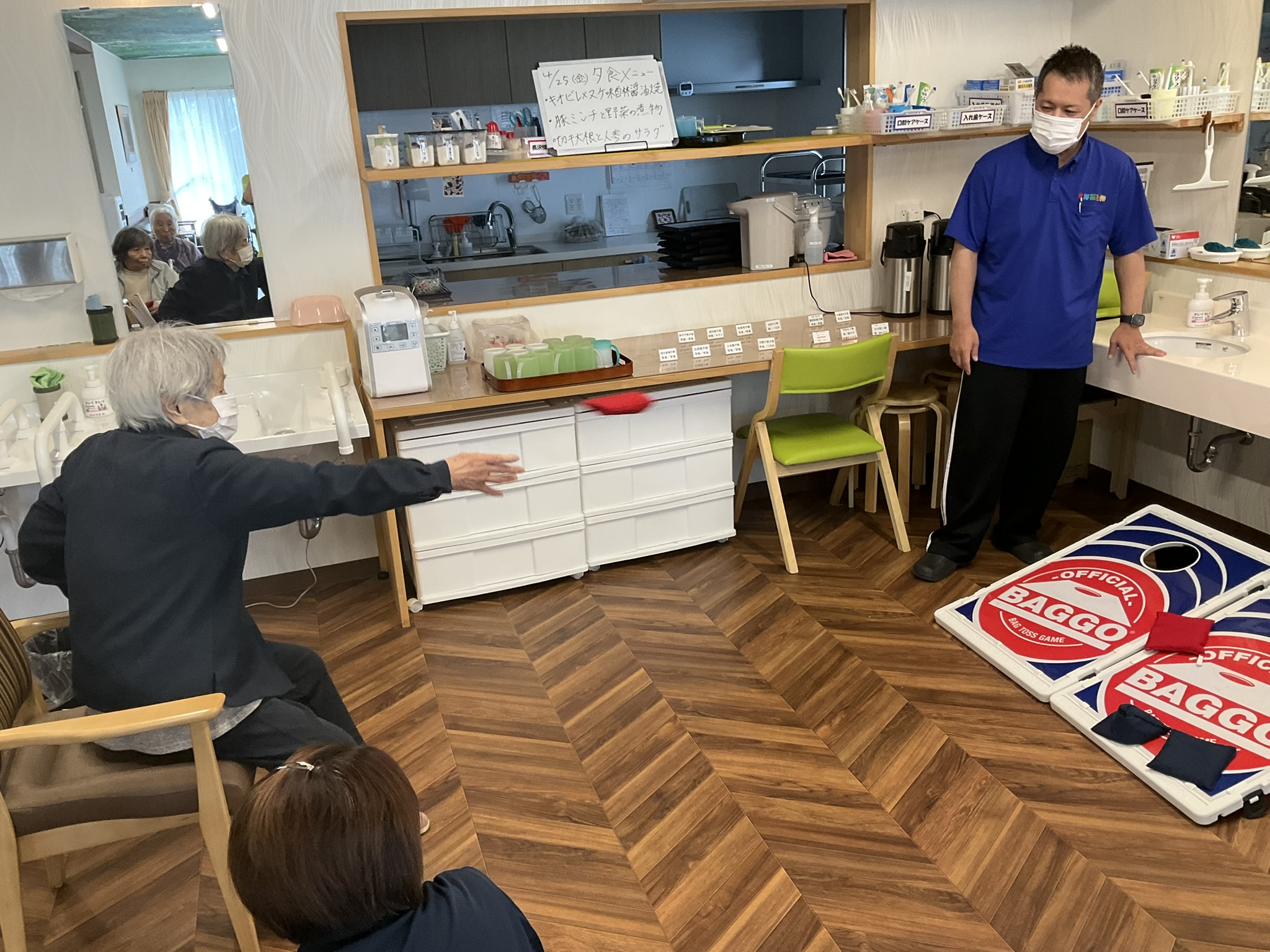 一か所に穴が開いているボードにビーンバッグを投げ、ボードに乗ったら1点、穴に入ったら3点を獲得できるゲームです。