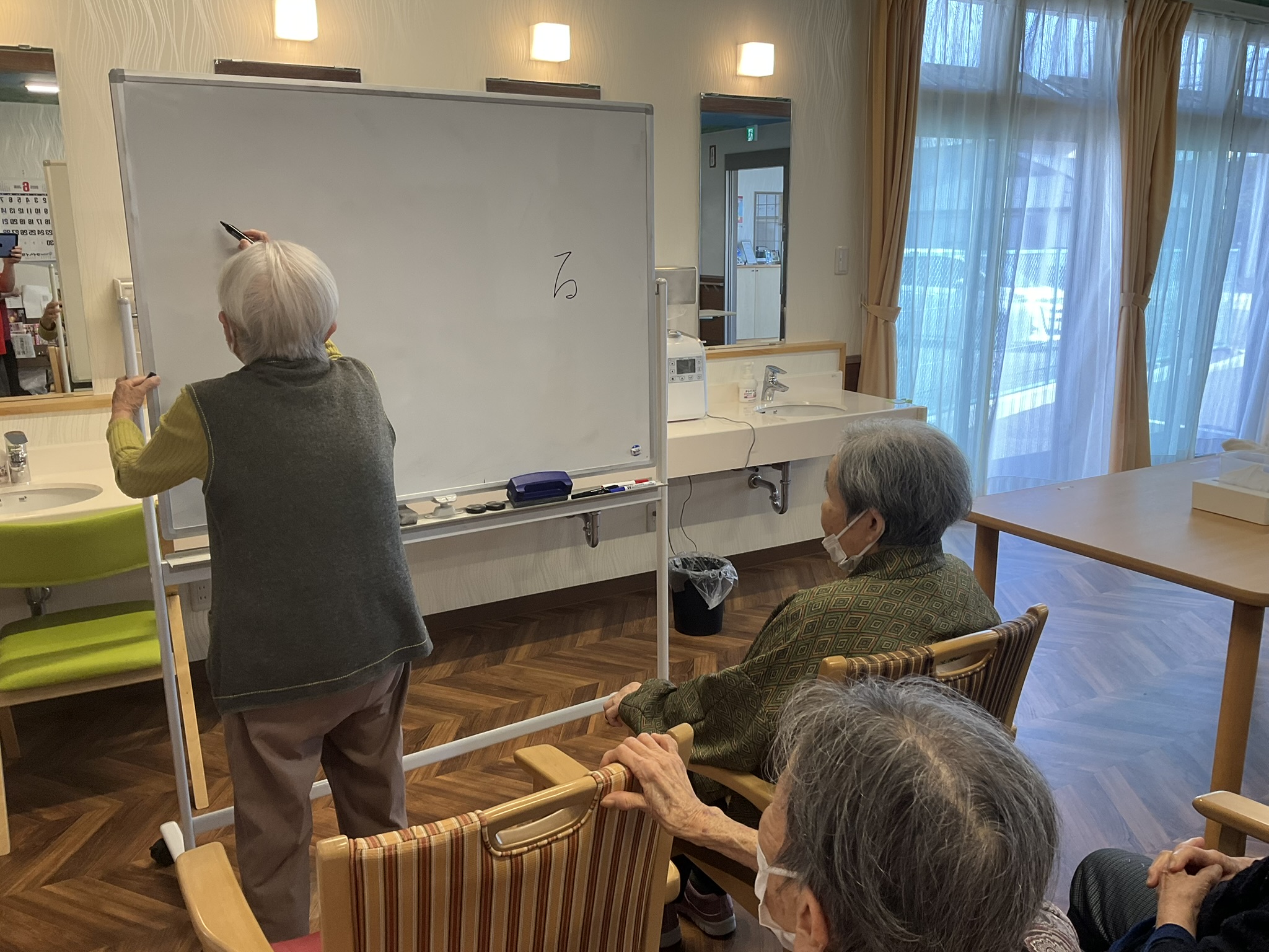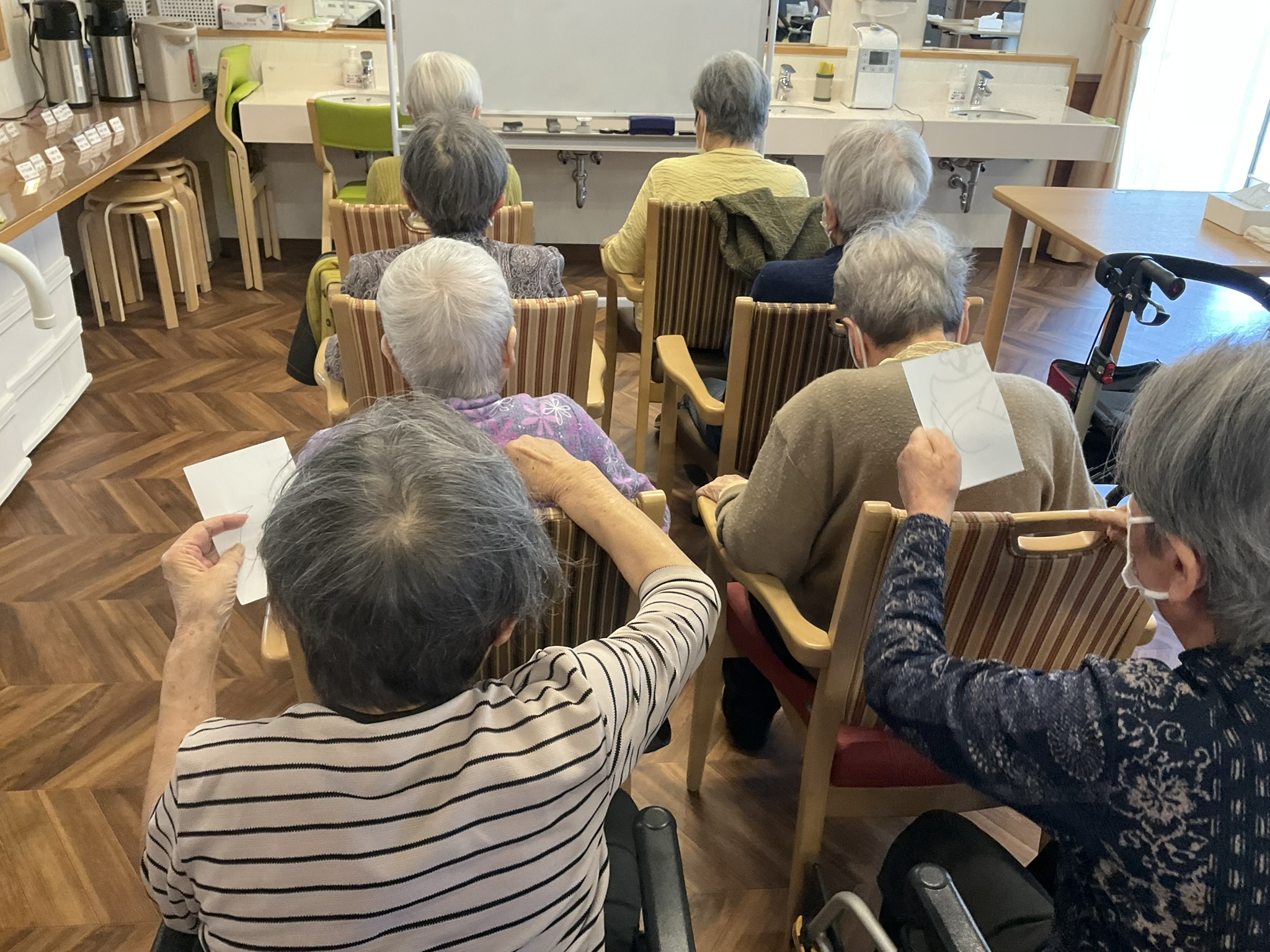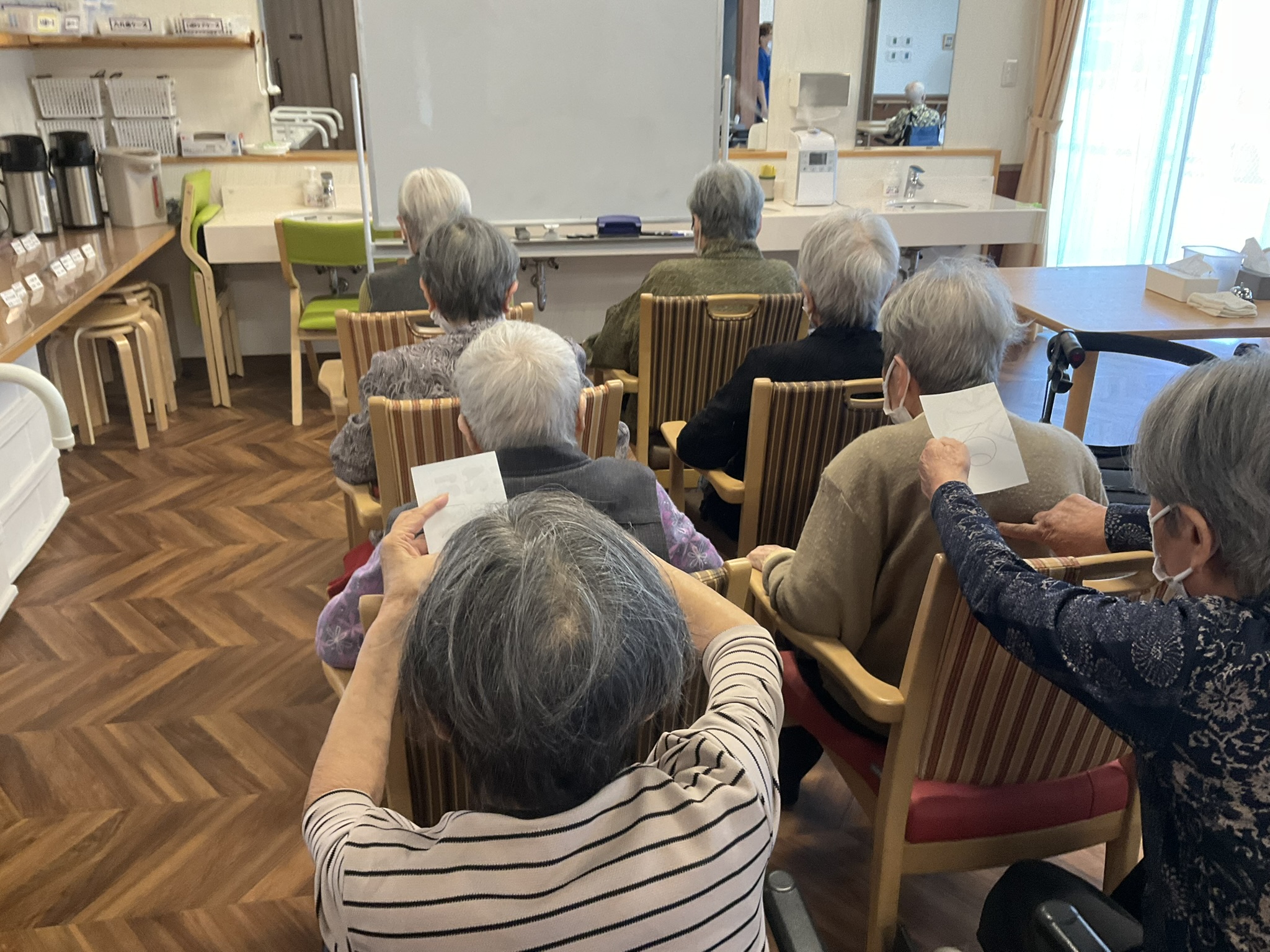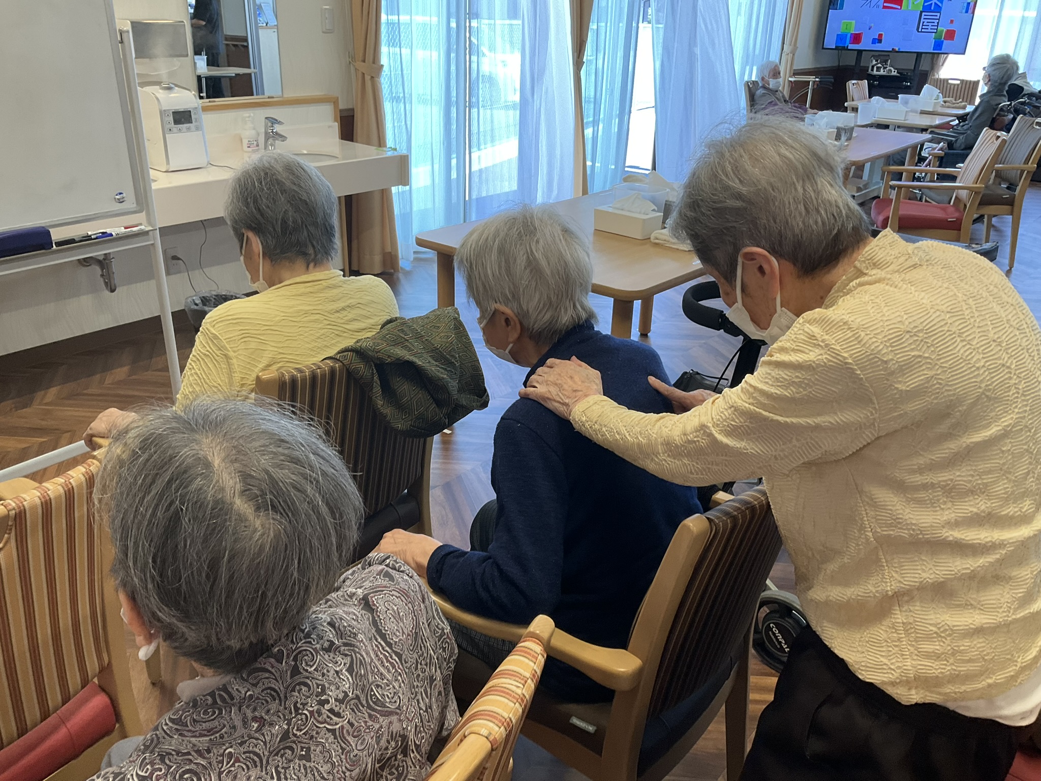 縦に4人づつ並んでいただき、後ろから背中文字を伝言ゲームのように前の利用者様に伝えていきます(^^♪